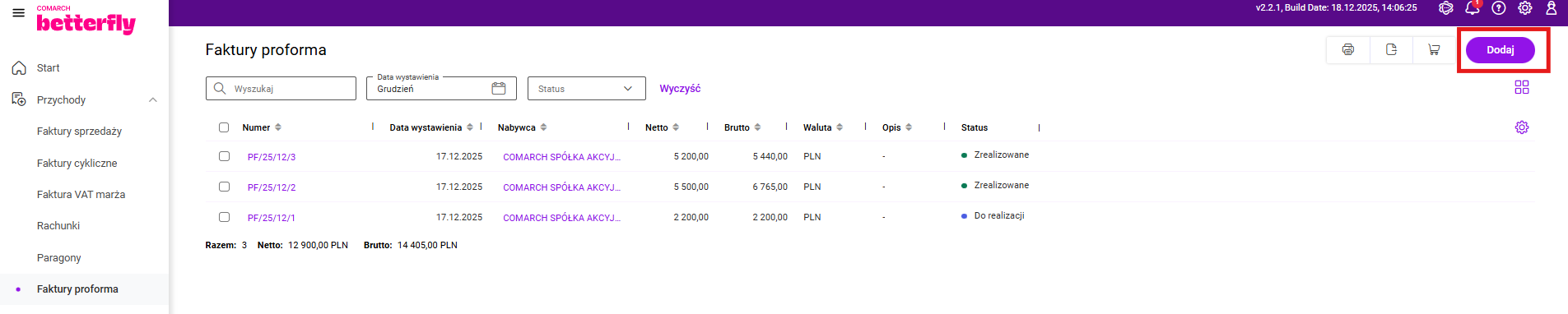 Krok pierwszy – wybieramy Przychody / Faktury proforma, a następnie w celu dodania nowej, klikamy na ikonkę „Dodaj”.