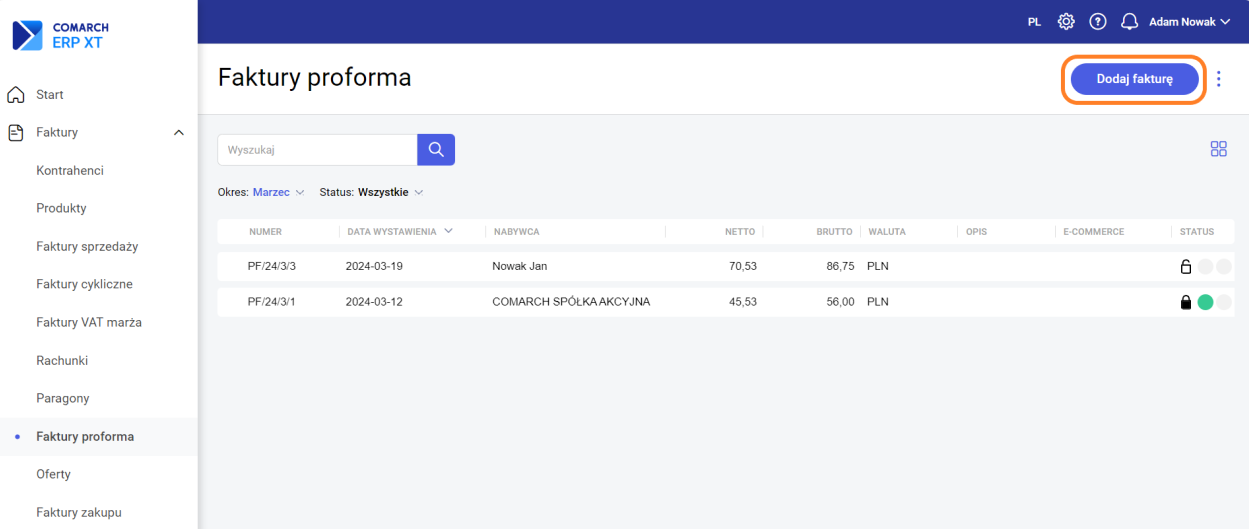 Krok pierwszy – wybieramy Faktury >> Faktury proforma, a następnie w celu dodania nowej, klikamy na ikonkę „+Dodaj fakturę”.