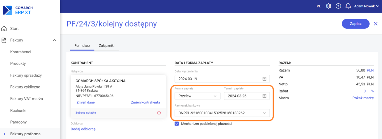 Zarówno forma płatności jak i numer rachunku bankowego zostaną przeniesione na dokumenty przekształcane z tej faktury proforma.