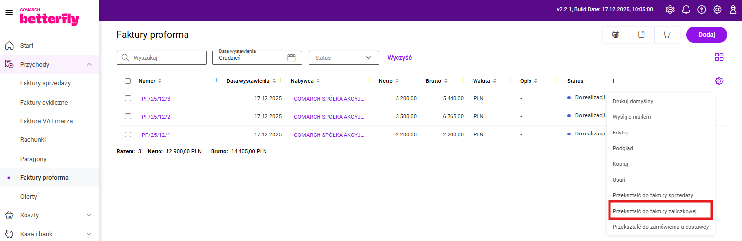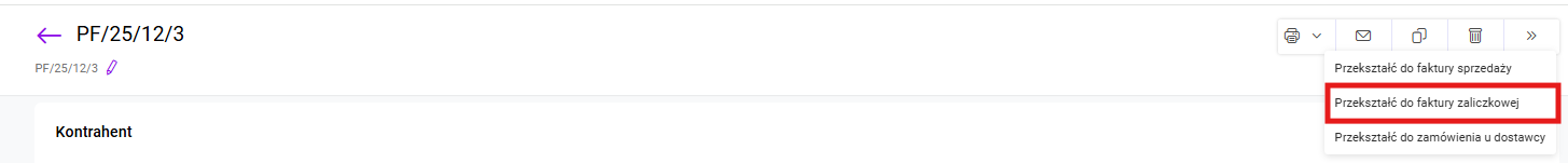Opcja „Przekształć do faktury zaliczkowej” dostępna jest: