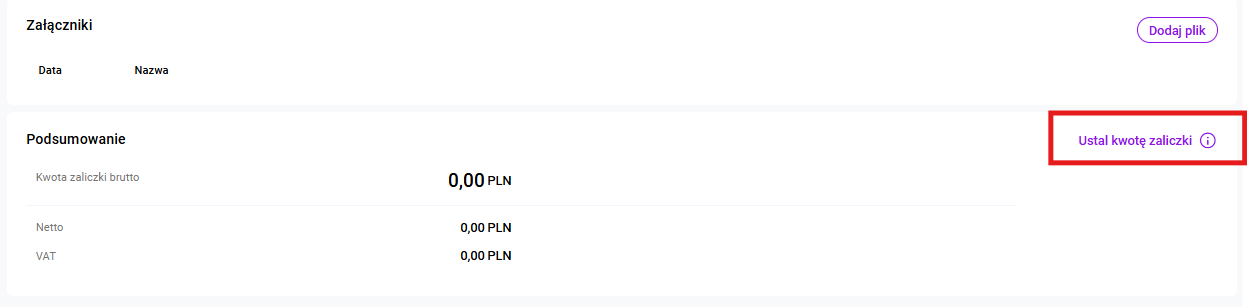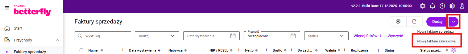 Dodanie faktury zaliczkowej na liście faktur sprzedaży