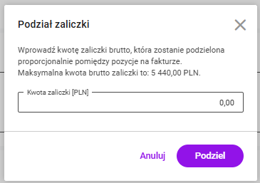 W okienku, które się pojawi wpisujemy kwotę zaliczki i klikamy na opcję „Podziel”. Kwota zostanie automatycznie podzielona pomiędzy elementy faktury. Należy teraz zapisać lub zatwierdzić fakturę.