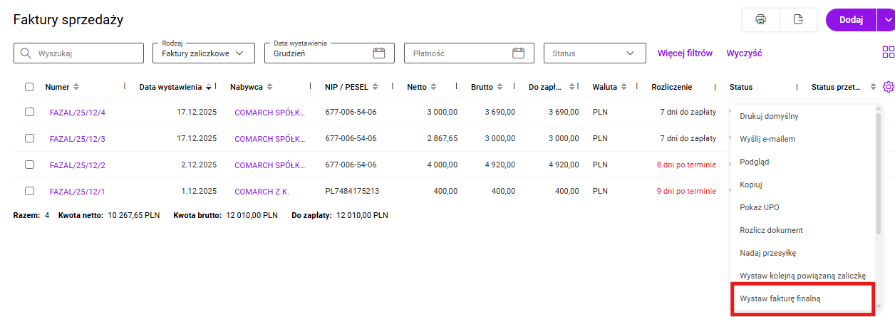 Opcja „Wystaw fakturę finalną” dostępna jest: