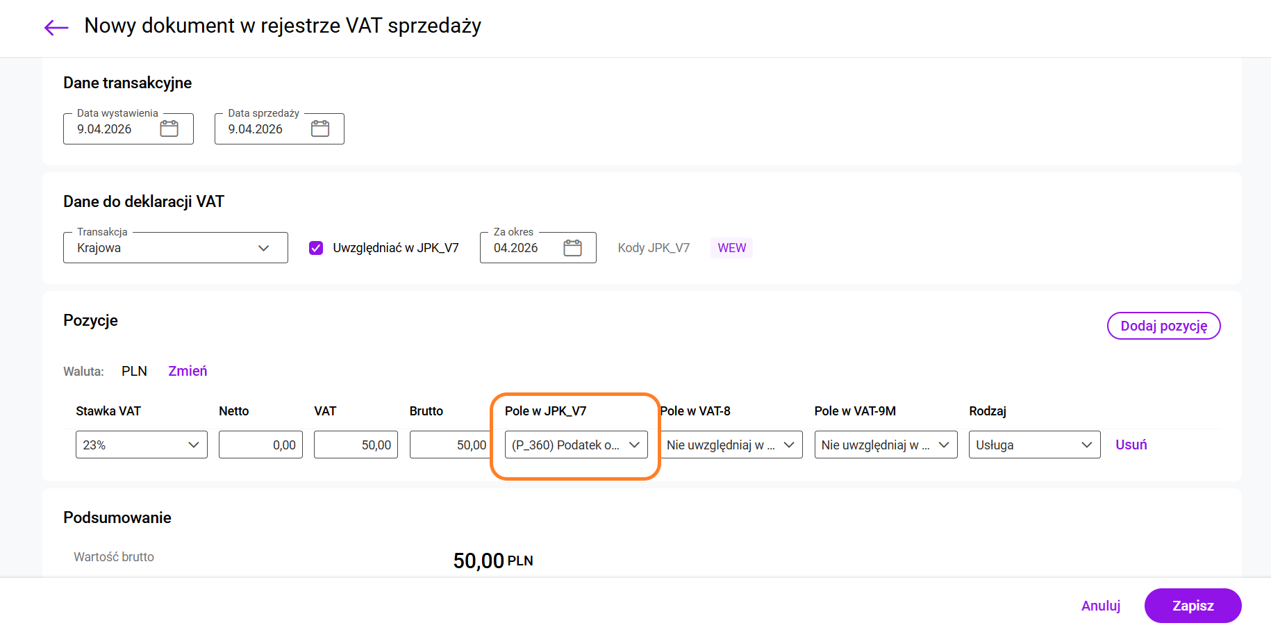 Tak zapisany dokument zostanie wykazany w pozycji P_360 w pliku JPK_V7.