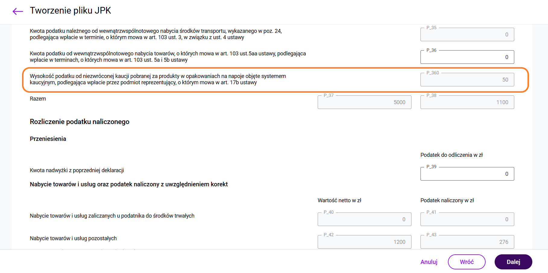 - w polu VAT wprowadzić wartość podatku od niezwróconej kaucji