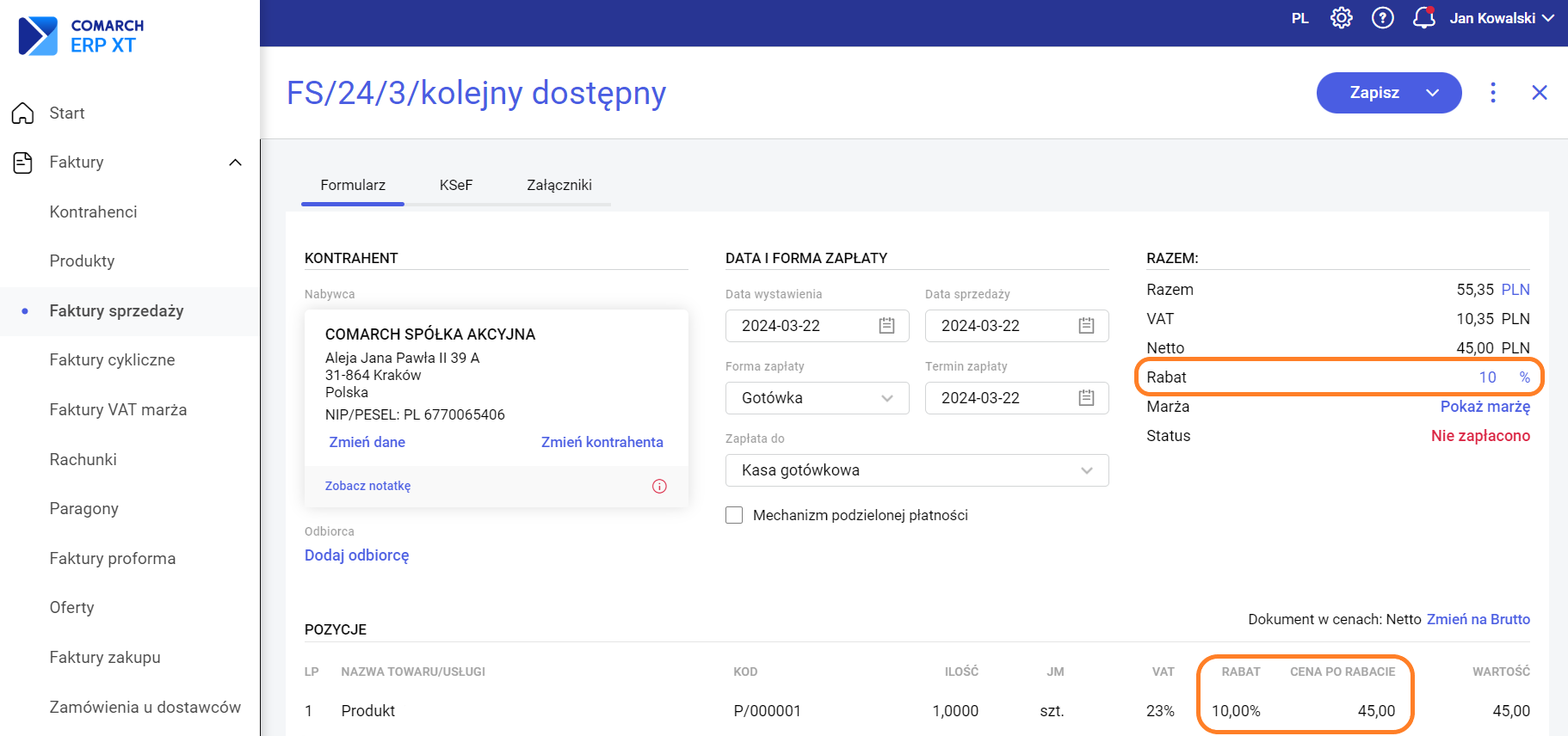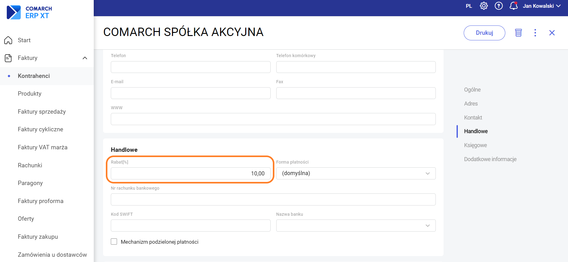 Procentową wartość rabatu można wpisać w przeznaczonym do tego polu w sekcji Handlowej. Po wybraniu kontrahenta jako nabywcy na dokumencie, ten rabat będzie automatycznie stosowany dla każdego kolejnego produktu na liście. Dotyczy to dokumentów sprzedażowych: faktury sprzedaży, rachunku, paragonu, faktury proforma, oferty.