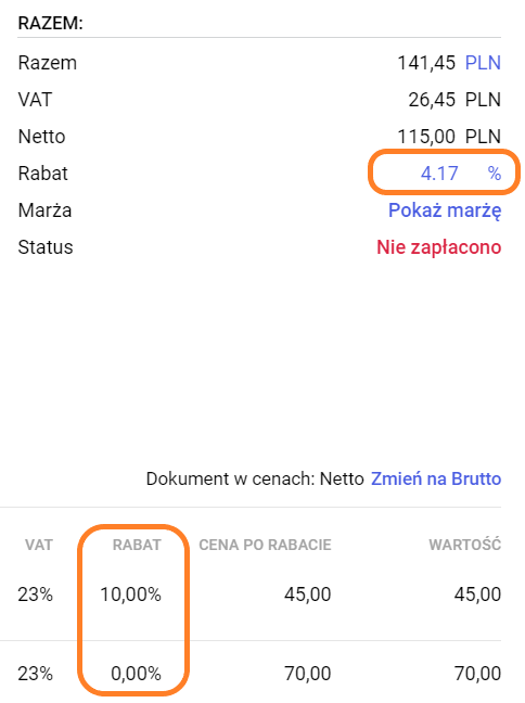 W podsumowaniu faktury, w sekcji Razem widoczny jest średni rabat wyliczany na podstawie wszystkich produktów na liście. Początkowo jest tam proponowany rabat domyślny ustalony na karcie kontrahenta, jednak w miarę dodawania produktów i ustalania cen sprzedaży, wartość procentowa tego rabatu jest wyliczana jako: