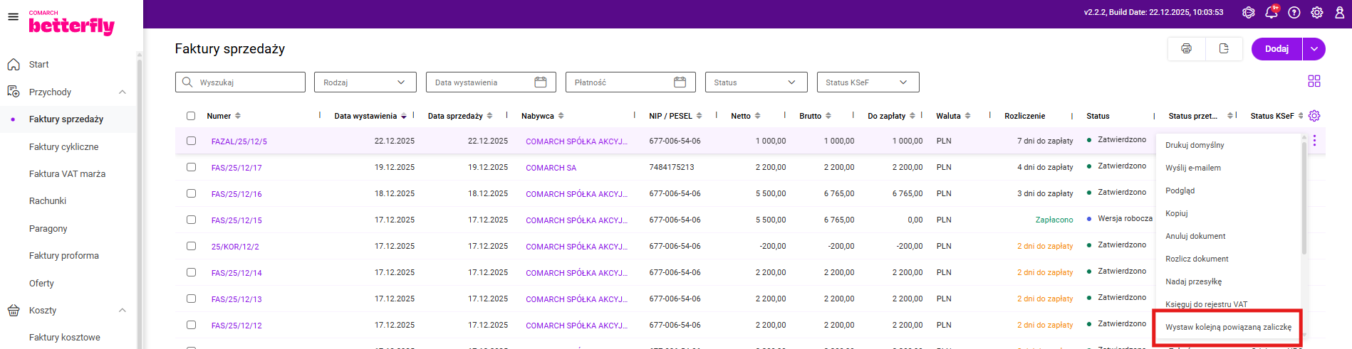 Krok trzeci – z menu kontekstowego dla pojedynczego dokumentu lub z formularza  wybieramy opcję „Wystaw kolejną powiązaną zaliczkę”. Jeśli zaliczki zostały wcześniej zarejestrowane do oferty lub faktury pro forma, można też do nich wystawić kolejne powiązane zaliczki.