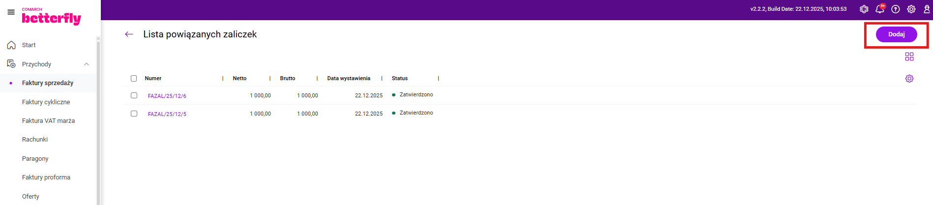Dodawanie kolejnych zaliczek do transakcji możliwe jest także na liście powiązanych zaliczek za pomocą przycisku Dodaj.