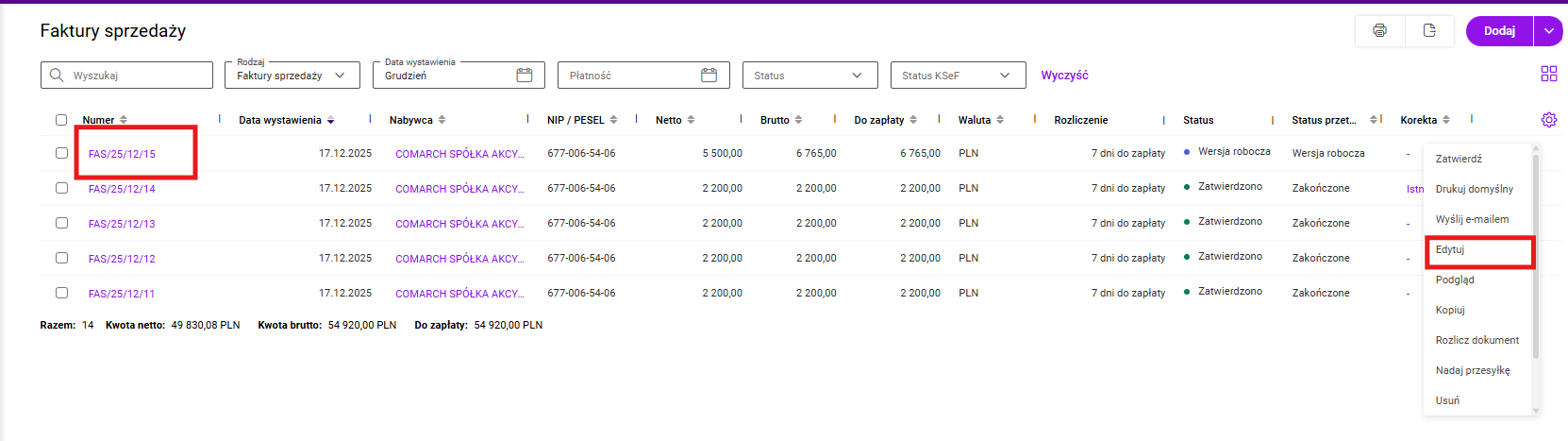 Dodajemy nową lub wybieramy interesującą nas fakturę, klikając w jej numer lub z menu kontekstowego dla pojedynczego dokumentu wybierając opcję „Edytuj”: