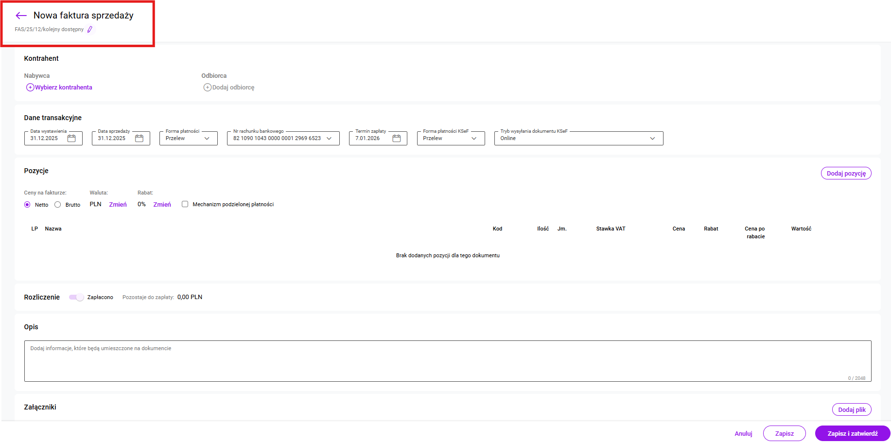 – jeśli istnieje konieczność nadania konkretnego numeru dokumentu można go wpisać po wybraniu opcji Nadany ręcznie. Wtedy dokument zostanie zapisany z podanym numerem pod warunkiem, że nie został on wcześniej wykorzystany na innym dokumencie w danym schemacie/ serii.