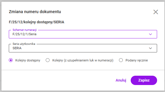– jeśli wybrana jest opcja Kolejny dostępny – przy zapisie zostanie nadany kolejny najwyższy numer w danym schemacie numeracji/ serii,