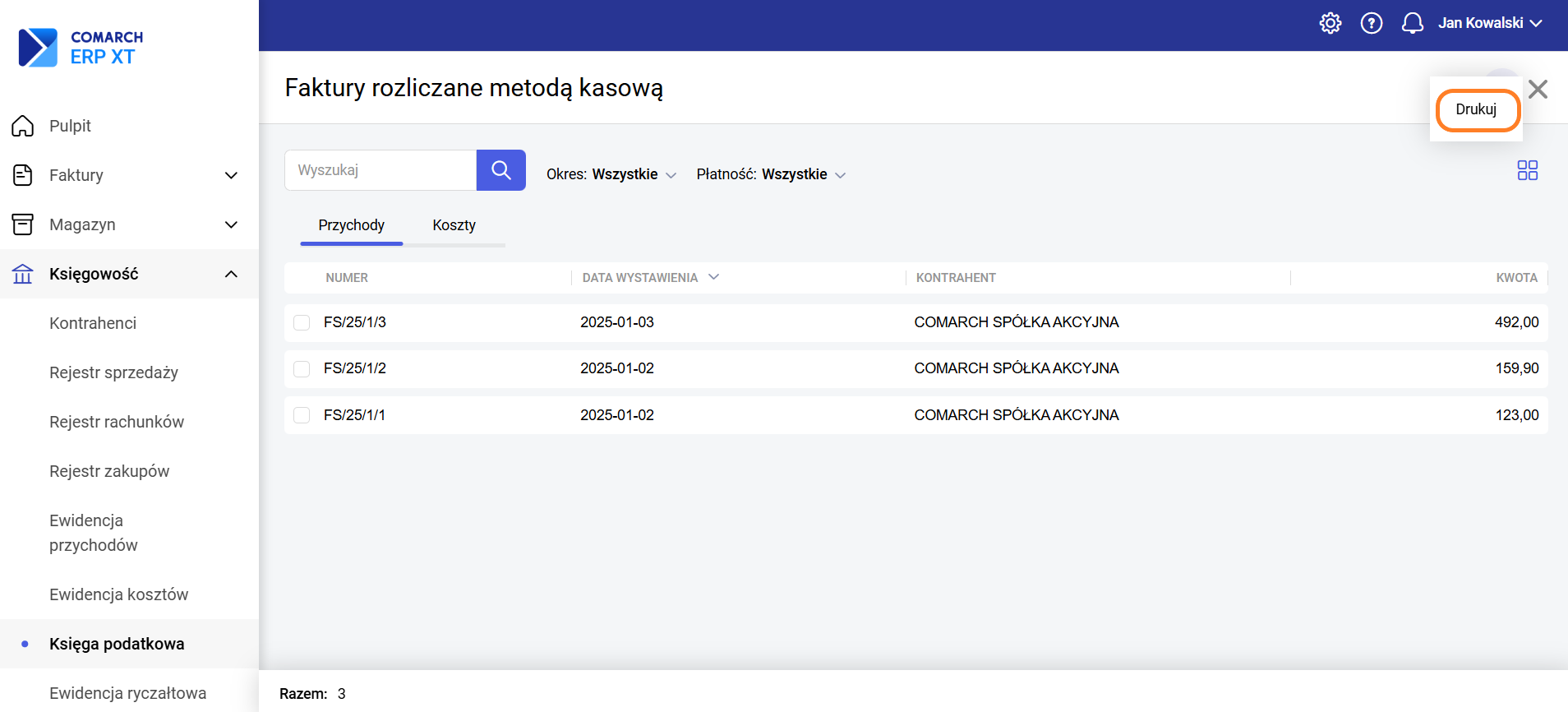 Z poziomu zakładki Przychody jest dostępny wydruk Przychody rozliczane metodą kasową.