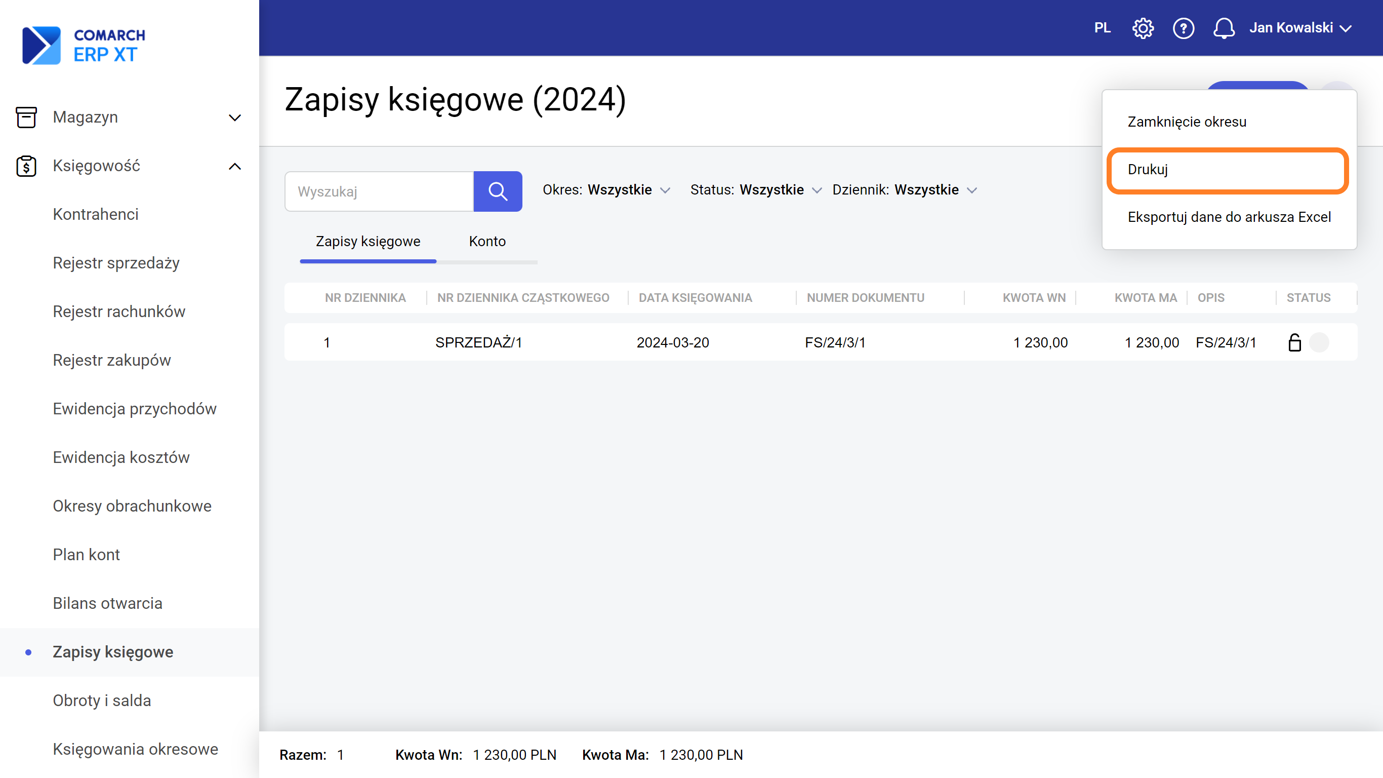 W programie Comarch Betterfly z poziomu listy zapisów księgowych możemy utworzyć odpowiedni rodzaj wydruku. W tym celu z menu kontekstowego wybieramy opcję „Drukuj”.