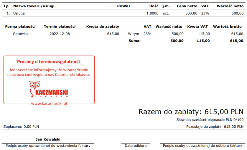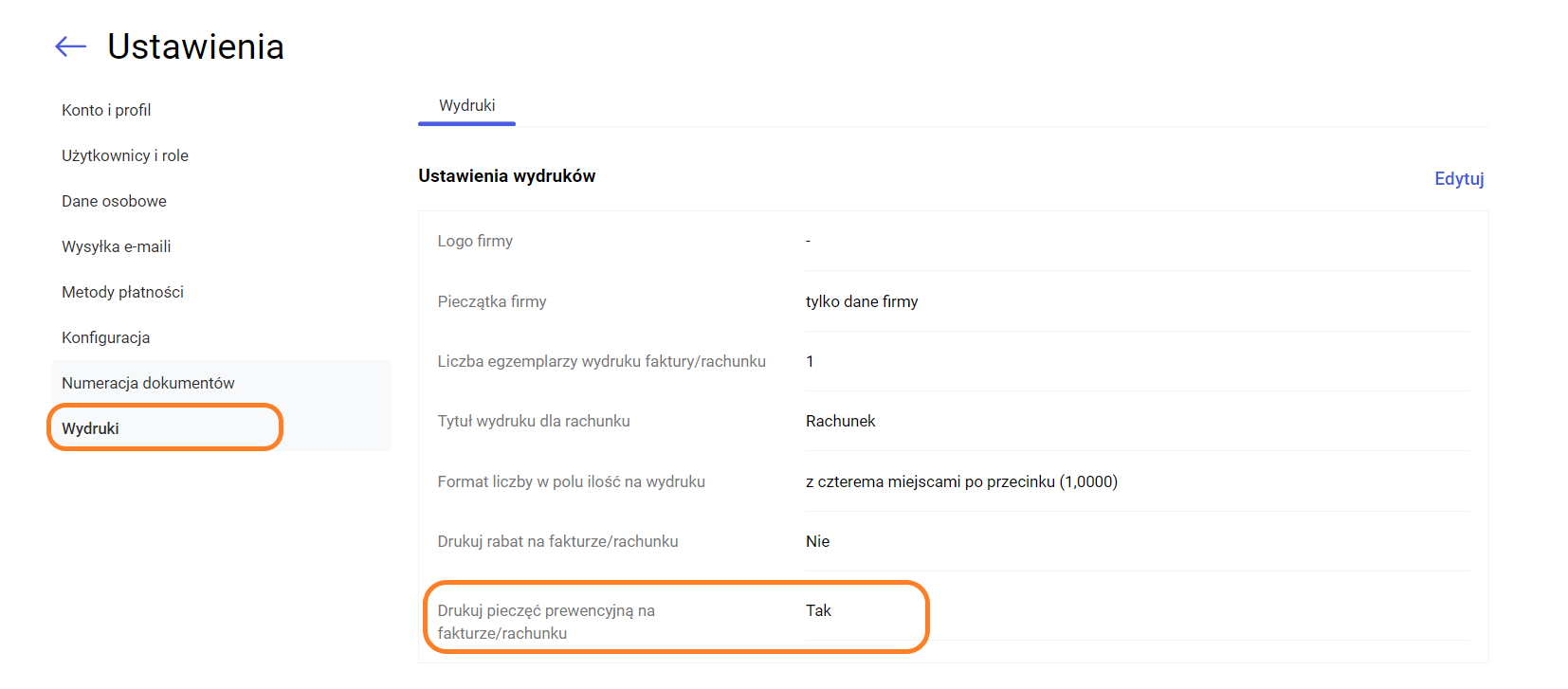 W Konfiguracji / Wydruki znajduje się parametr: „Drukuj pieczęć prewencyjną na fakturze/rachunku”.