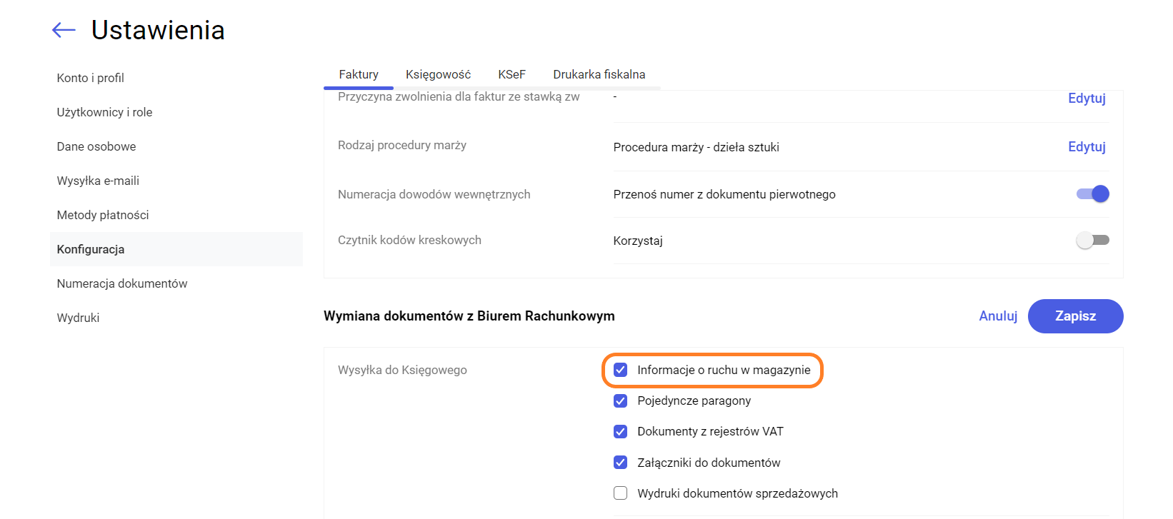 W tym artykule opisaliśmy możliwość wyeksportowania do Biura Rachunkowego dokumentów magazynowych. Jeżeli posiadamy pakiet Faktury + Magazyn i zaznaczy w Konfiguracja/ Faktury/ Konfiguracja parametr Informacje o ruchu w magazynie, do Biura Rachunkowego będą wysyłane również dokumenty (o ile zostały wystawione i zatwierdzone na stałe) tj. :