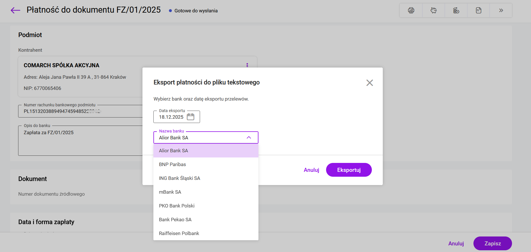 Po wyborze: Eksportuj tworzony jest plik w formacie TXT lub CSV (w zależności od wybranego banku).