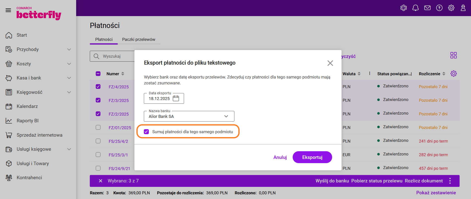 Na liście można zaznaczyć kilka przelewów i w ten sposób wyeksportować je do jednego pliku. Jeżeli zostanie zaznaczony parametr: Sumuj płatności dla tego samego podmiotu, to w przypadku przelewów zwykłych oraz do Urzędu Skarbowego przelewy dla tego samego kontrahenta będą grupowane w jeden.