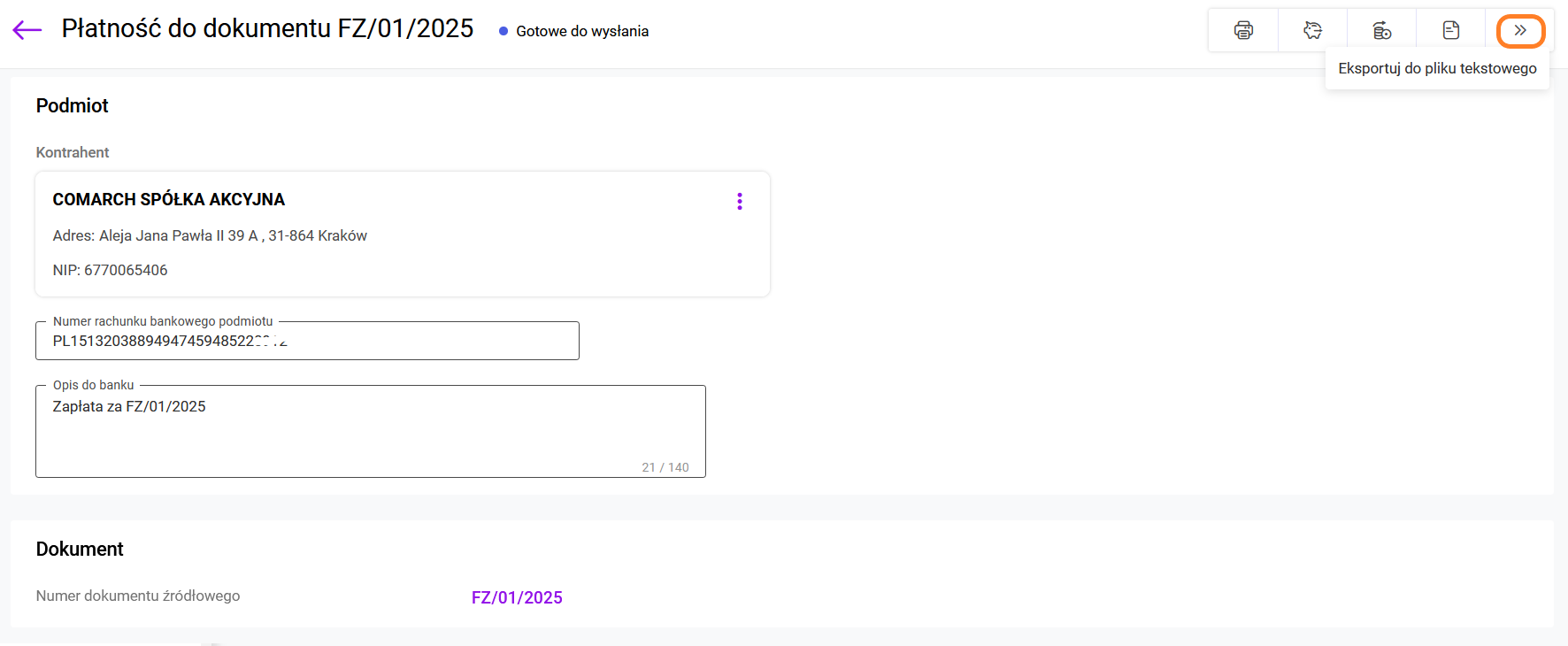 Eksport przelewów jest dostępny z poziomu formularza płatności, która jest płatnością rozchodową, a także jest zatwierdzona i nierozliczona bądź rozliczona częściowo. Aby wyeksportować taką płatność należy w górnym prawym menu wybrać: Eksportuj do pliku tekstowego.