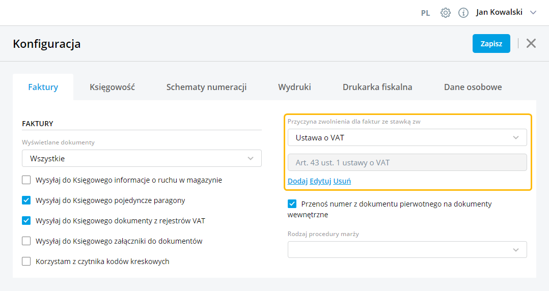 W celu wykazywania wartości w odpowiednich polach w plikach JPK_FA, w programie wprowadzono obowiązek wprowadzania przyczyny zwolnienia na dokumentach ze stawką ZW w polu Przyczyna zwolnienia. Przyczyna pobierana jest z pola Przyczyna zwolnienia dla faktur ze stawką zw, dostępnego w menu Konfiguracja/Faktury.