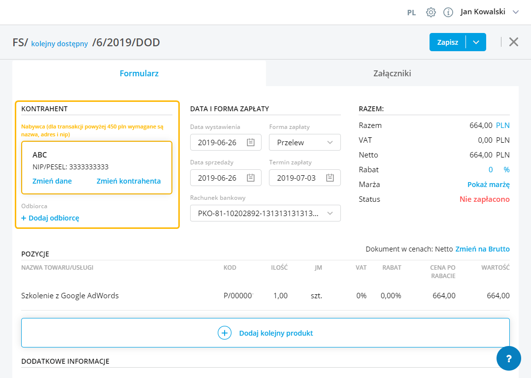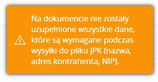 W chwili wybrania na dokument sprzedażowy przekraczający wartość 450 PLN brutto kontrahenta bez wymaganych danych, tj. nazwa, adres, NIP, w polu Kontrahent pojawi się ostrzeżenie „Nabywca: (wymagane dane kontrahenta – nazwa, adres, nip)” oraz przy zapisie komunikat „Na dokumencie nie zostały uzupełnione wszystkie dane, które są wymagane podczas wysyłki do pliku JPK (nazwa, adres kontrahenta, NIP)”.