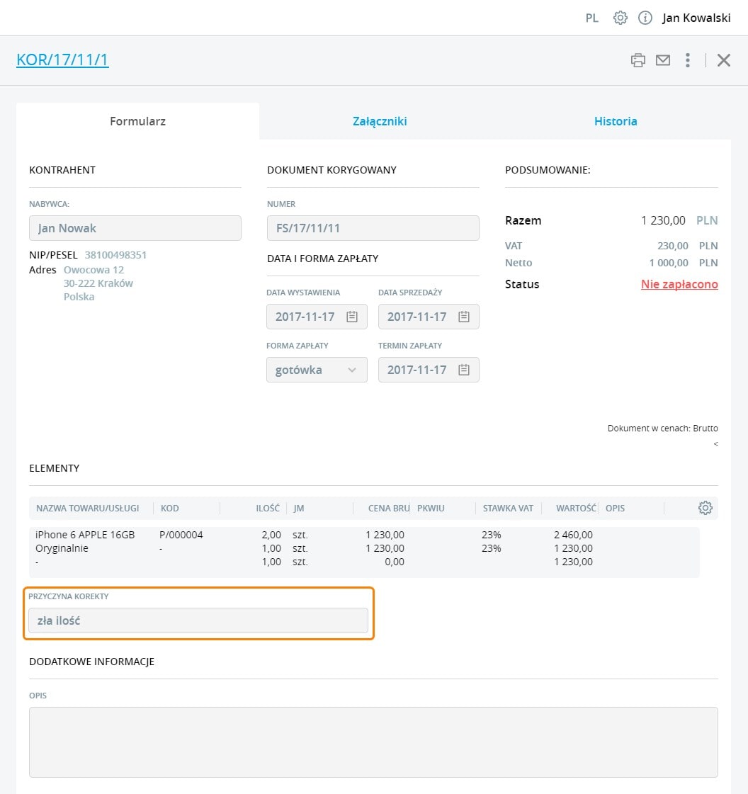 Ponadto dla dokumentów korygujących wprowadzono pole Przyczyna korekty, które jest wymagane przy wysyłce pliku JPK_FA. Program uniemożliwia zapisanie dokumentu bez przyczyny korekty, pokazując odpowiedni komunikat „Popraw błędy na formularzu”