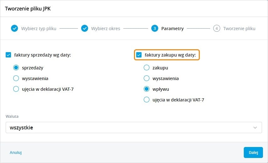 Podczas generowania plików JPK_FA istnieje możliwość wyboru daty, według której dokumenty zostaną pobrane do pliku. Dla faktur sprzedaży istnieją następujące możliwości: data sprzedaży (domyślna), wystawienia, ujęcia w deklaracji. Dla faktur zakupu: data zakupu, wystawienia, wpływu (domyślna), ujęcia w deklaracji.