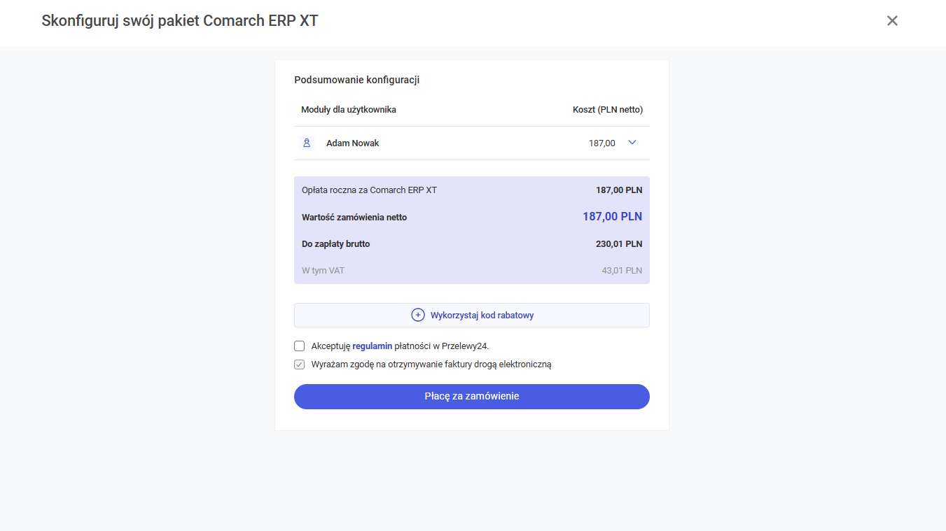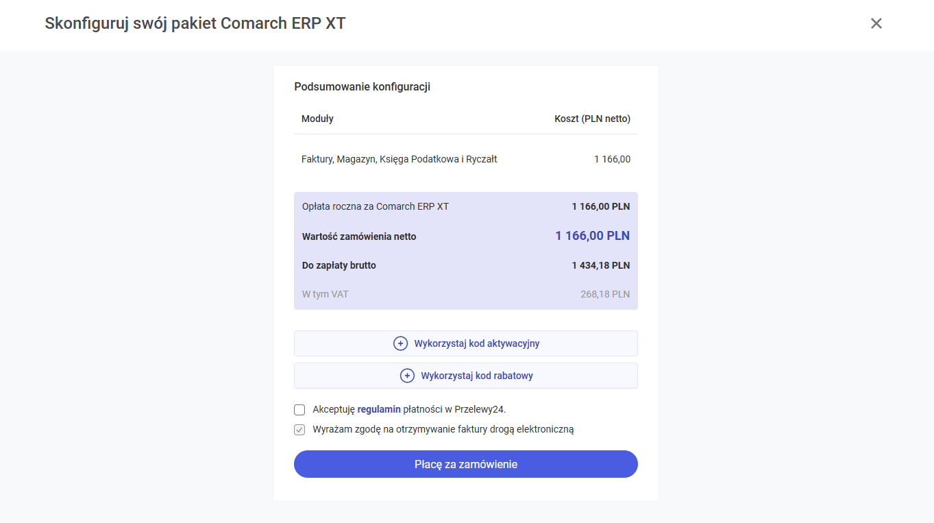 Inna opcja zakupu pakietu: Jeśli Użytkownik nie chce korzystać z płatności przez Przelewy24, może zakupić specjalny kod w sklepie internetowym Comarch. Płatność jest wtedy dokonywana podczas składania zamówienia w sklepie przez wszystkie dostępne tam kanały. Szczegółowe informacje znajdują się w artykule: „Jak aktywować pakiet kodem?” Zobacz także: