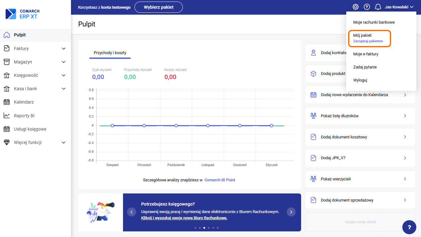 Krok 1: Otwieramy ustawienia konta i wybieramy opcję Mój pakiet.