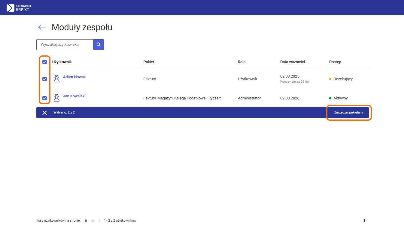 Krok 2: Na liście Użytkownicy zaznaczamy wybrane pozycje i klikamy przycisk Zarządzaj pakietami.