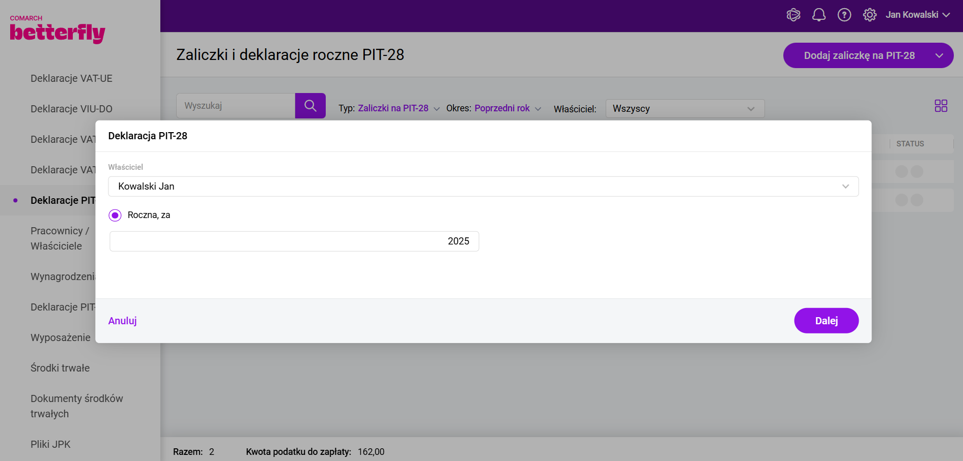 Sekcja L zawiera informacje o obliczonym ryczałcie po odliczeniach od przychodów. W poz. 225 Użytkownik ma możliwość wprowadzenia kwoty doliczenia do ryczałtu, a w poz. 227 wartość kwoty podatku zapłaconego za granicą – zgodnie z art. 27 ust. 9 i 9a ustawy o podatku dochodowym w związku z art. 12 ust. 12 ustawy. Sekcja M zawiera informacje o odliczeniach od ryczałtu. Sekcja N zawiera obliczenie należnego ryczałtu. W poz. 234. Użytkownik może wprowadzić kwotę 20% należnego ryczałtu wykazanego w zeznaniu składanym za rok podatkowy objęty zwolnieniem, o którym mowa w art. 21 ust. 6-13 ustawy oraz podać Rok w poz. 233. Wartość wprowadzona w poz. 234 powiększy kwotę ryczałtu do zapłaty. Sekcja O zawiera informacje o zwolnieniu, o którym mowa w art. 21 ust. 6-13 ustawy. Sekcja P zawiera informacje o ryczałcie do zapłaty lub nadpłacie. Pozycja 236 Wpłacony ryczałt zawiera sumę zapłaconego podatku z poszczególnych zaliczek. Sekcja Q zawiera informacje o ryczałcie obliczonym i wykazanym w ewidencji przychodów w poszczególnych miesiącach lub kwartałach, a także obliczonym przez podatnika, o którym mowa w art. 15 ust.3 ustawy (po dokonanych odliczeniach). Do odpowiednich pól w sekcji Q są przenoszone kwoty naliczonego do zapłaty podatku ryczałtowego za poszczególne miesiące/kwartały. Sekcja R zawiera informację o przychodach osiągniętych w okresie zawieszenia wykonywania działalności gospodarczej. Sekcja S zawiera informację o przychodach z odpłatnego zbycia składników majątku, o których mowa w art. 14 ust. 2 pkt 1 i 19 ustawy o podatku dochodowym Sekcja T zawiera wniosek o przekazanie 1,5 % podatku należnego na rzecz Organizacji Pożytku Publicznego (OPP). Kwota 1,5 % podatku jest automatycznie wyliczana po uzupełnieniu na formularzu deklaracji rocznej Numeru KRS organizacji. Wnioskowaną kwotę można pomniejszyć. Program Comarch Betterfly oferuje możliwość swobodnego wyboru wspieranej Organizacji Pożytku Publicznego kwotą z tytułu 1,5% należnego ryczałtu. Sekcja U zawiera informacje uzupełniające ułatwiające kontakt z podatnikiem. Sekcja V zawiera informacje o załącznikach. Pola z ilością załączników PIT-28/B, PIT/O, PIT/D, PIT/2K są automatycznie uzupełniane, na podstawie dodanych załączników do deklaracji PIT-28. Informacje dodatkowe o załączniku PIT/D należy uzupełnić ręcznie. Sekcja W Karta Dużej Rodziny – użytkownik ma możliwość zaznaczenia informacji o posiadaniu przed Podatnika ważnej KDR. Sekcja X – Użytkownik ma możliwość zaznaczenia informacji o kwartalnym sposobie opłacania ryczałtu na podstawie art. 21 ust. 1a ustawy oraz możliwość zaznaczenia informacji o wyborze metody ustalania daty powstania przychodów na podstawie art. 14 ust. 1j ustawy o podatku dochodowym. Sekcja Y pozwala wprowadzić informację o rachunku osobistym właściwym do zwrotu nadpłaty. W polu 271 należy wprowadzić pełny numer rachunku bankowego z prefiksem kraju (w przypadku Polski do numeru rachunku bankowego należy dodać prefiks PL). Załączniki Załącznik PIT-28/B zawiera informacje o przychodach podatnika z działalności prowadzonej w formie spółki (spółek). Jeżeli właściciel ma udział w działalności podstawowej mniejszy niż 100%, wtedy do deklaracji zostanie automatycznie dodany załącznik PIT-28/B. W przypadku, kiedy właściciel miał zmienny udział w trakcie roku wówczas na załączniku PIT-28/B zostaną wykazane przychody w oddzielnych sekcjach tyle razy, ile było różnych udziałów w trakcie roku. Załącznik PIT/O zawiera informacje o odliczeniach od dochodu (przychodu) i od podatku. Dane podatnika są uzupełniane automatycznie danymi z deklaracji PIT-28. Informacje o poszczególnych odliczeniach użytkownik ma możliwość uzupełnić w odpowiednich polach. W przypadku wypełnienia kwot przekazanych przez podatnika darowizn należy również uzupełnić sekcję D. Informacje o przekazanych darowiznach oraz o obdarowanych. W przypadku korzystania przez podatnika z ulgi dla rodzin 4+ należy wypełnić sekcję E. Informacja o dzieciach uprawniających do ulgi dla rodzin 4+. Po zapisaniu załącznika PIT/O sumy kwot z części B i C zostaną przeniesione odpowiednio na deklarację PIT-28 do poz. 99. Odliczenia wykazane w części B załącznika PIT/O oraz do poz. 229. Odliczenia wykazane w części C załącznika PIT/O. Załącznik PIT/D zawiera informację o odliczeniu wydatków mieszkaniowych. Po zapisaniu załącznika PIT/D kwoty wydatków wykazanych w tym załączniku zostaną przeniesione do odpowiednich pozycji zeznania PIT-28. Jeżeli podatnik po raz pierwszy dokonuje odliczeń w ramach ulgi odsetkowej z tytułu spłaty odsetek od kredytu (pożyczki) zaciągniętego na cele mieszkaniowe w latach 2002-2006, należy razem z załącznikiem PIT/D złożyć oświadczenie PIT-2K. Załącznik PIT/2K to oświadczenie o wysokości wydatków związanych z inwestycją służącą zaspokajaniu potrzeb mieszkaniowych. Użytkownik ma możliwość wydrukowania wypełnionej deklaracji PIT-28 wraz z wypełnionymi załącznikami. Korekta deklaracji PIT-28 Korektę deklaracji PIT-28 Użytkownik może dodać, jeżeli jest już obliczona deklaracja roczna PIT-28 dla wybranego właściciela za ten sam rok. Aby dodać korektę należy w menu Księgowość/Deklaracje PIT-28 wybrać Dodaj deklarację PIT-28, wskazać właściciela oraz właściwy rok. Dla właściciela, który ma już obliczoną deklarację roczną PIT-28 w wybranym okresie, pojawi się pytanie: Płatności Płatności dla deklaracji mają odpowiednio numery zaczynające się od „PIT-28”. Na formularzu takiej płatności, jako podmiot przenoszony jest wybrany na dokumencie Urząd Skarbowy. Na płatności dla deklaracji PIT-28 do pola Rachunek bankowy podmiotu podstawiany jest także Indywidualny Rachunek Podatkowy uzupełniony na indywidualnej karcie właściciela (szczegółowe informacje: Indywidualny Rach
