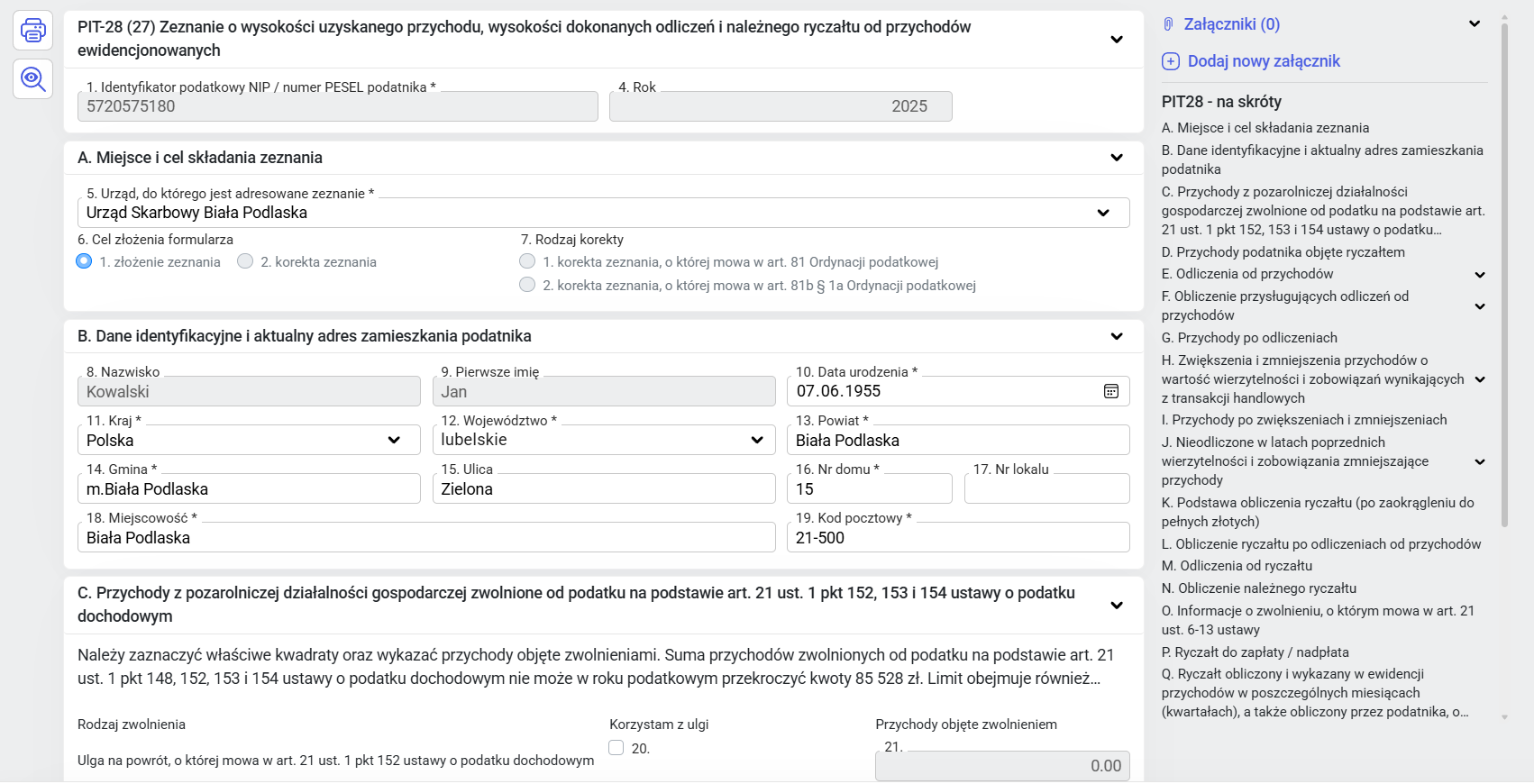 Po przejściu przez kreator otworzy się formularz deklaracji rocznej PIT-28.