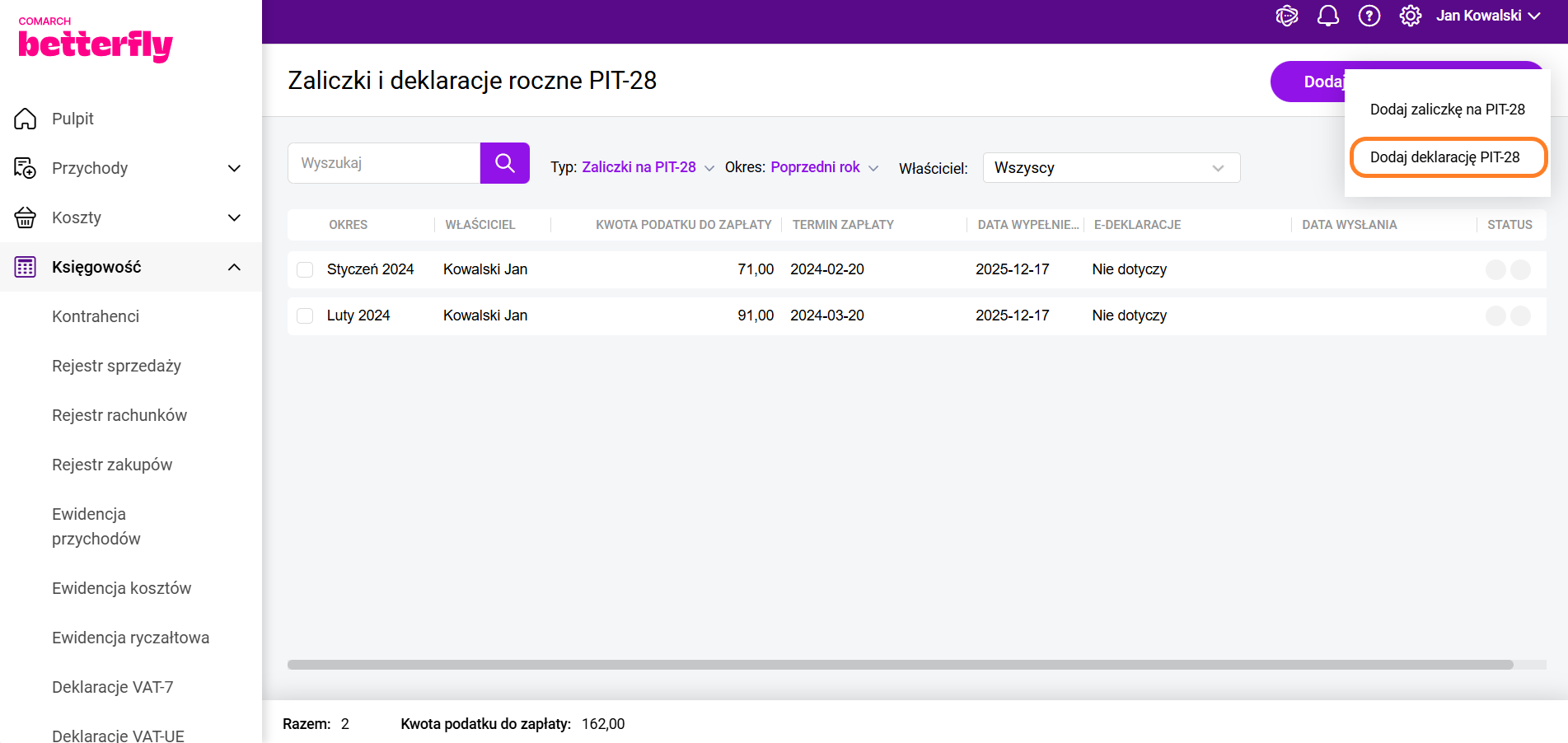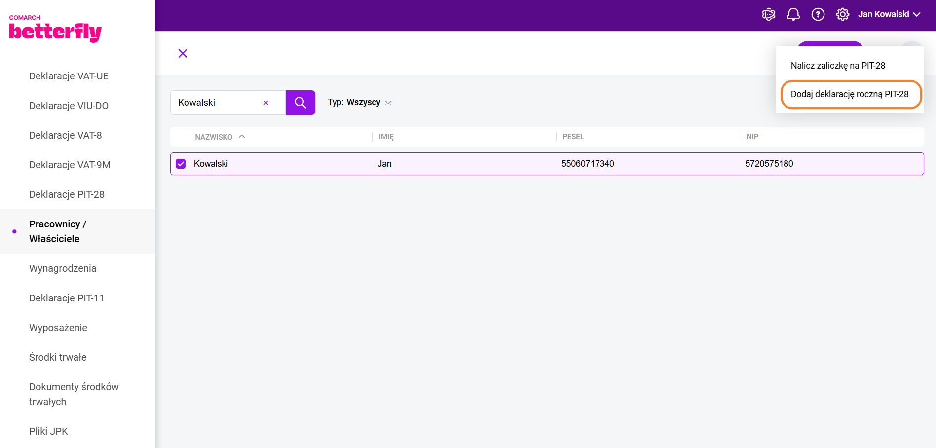 Dla pakietu zawierającego moduł Księga Podatkowa i Ryczałt przy wybranym rodzaju księgowości Ewidencja ryczałtowa, deklarację roczną PIT-28 można również obliczyć po zaznaczeniu właściciela w Księgowość/Pracownicy/Właściciele w menu kontekstowym znajduje się opcja 'Dodaj deklarację roczną PIT-28′.