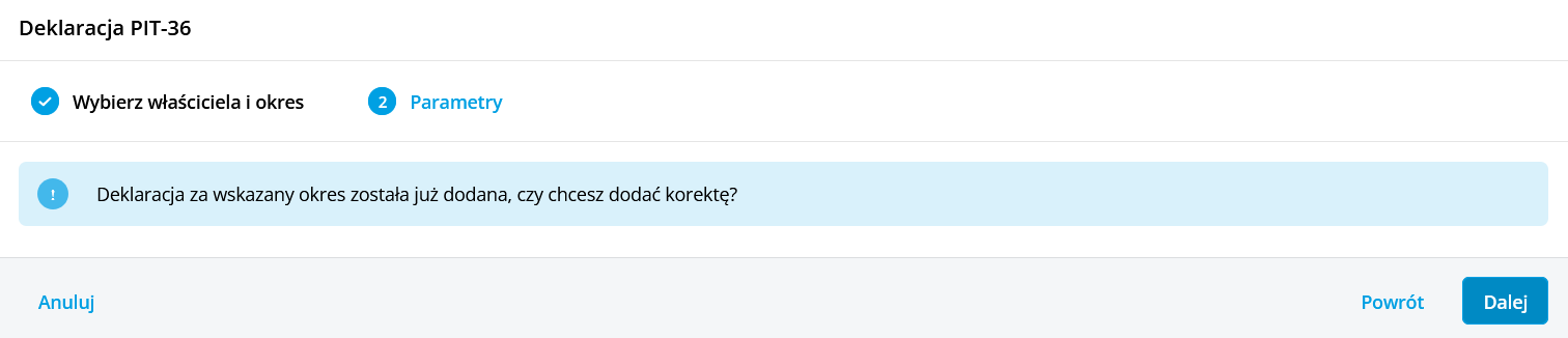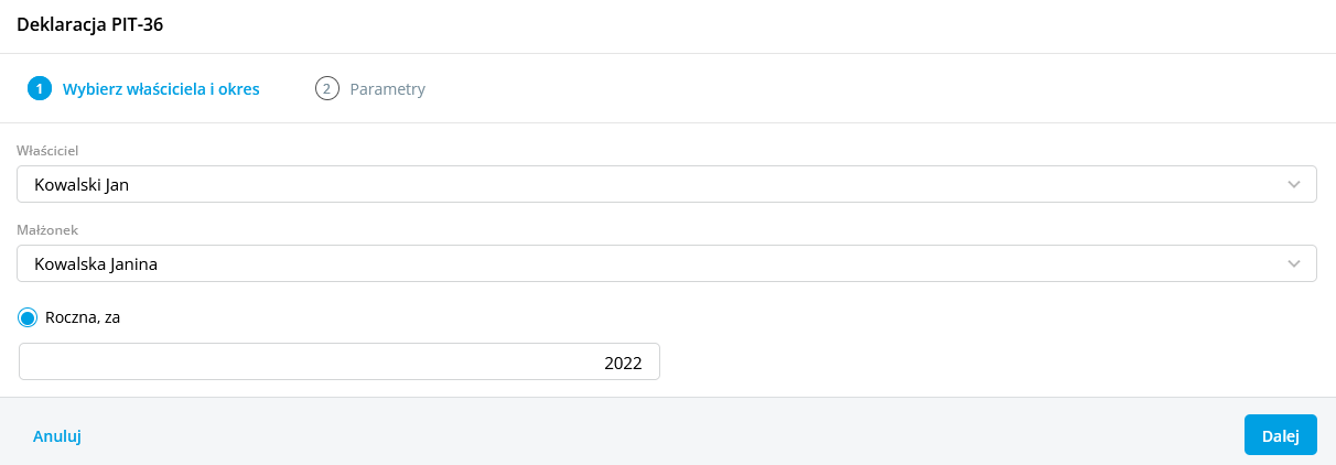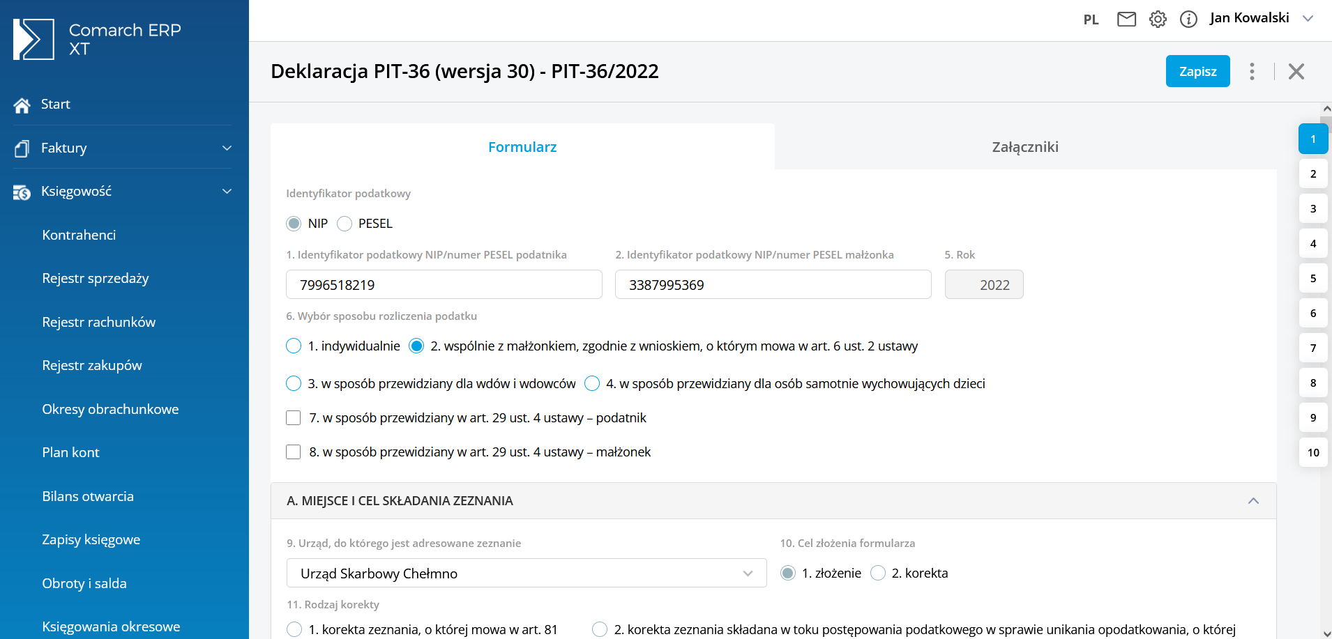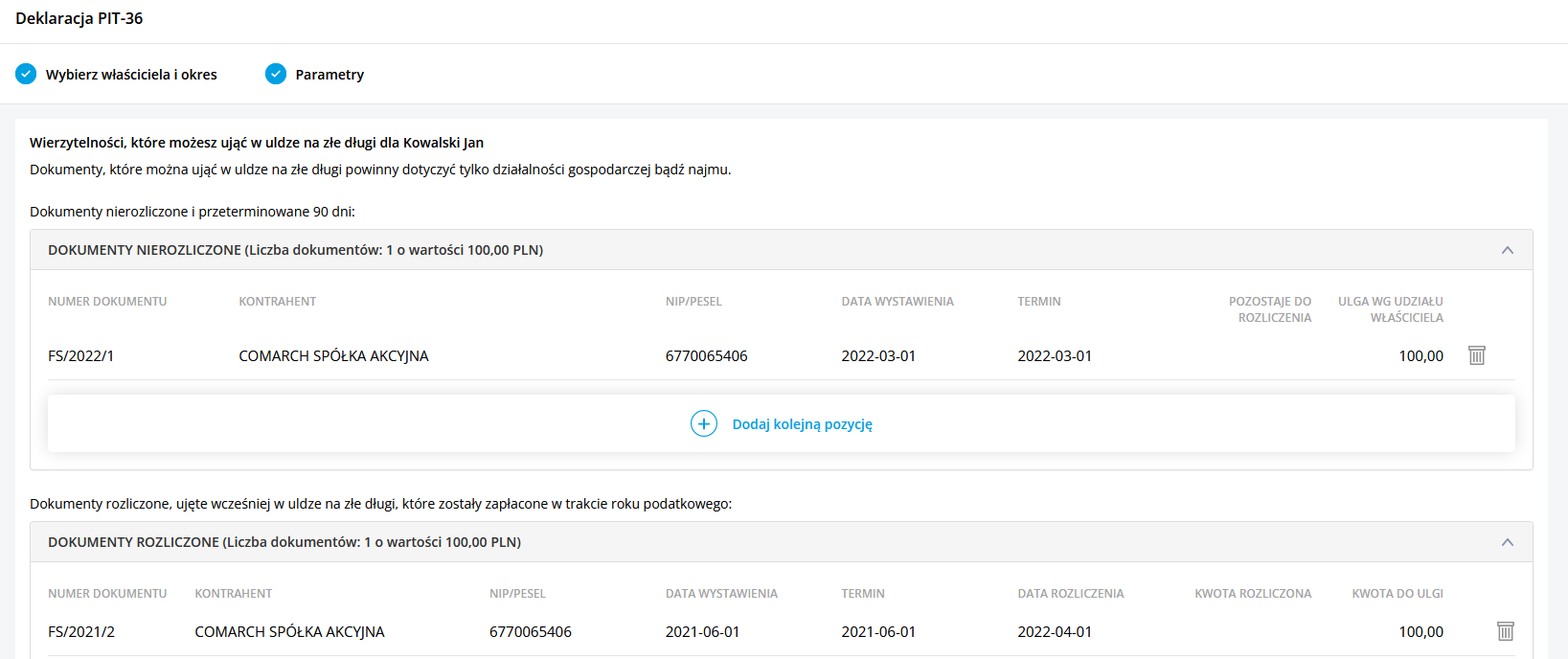 W przypadku wyboru sposobu opodatkowania wspólnie z małżonkiem istnieje możliwość wskazania małżonka z listy właścicieli. Wtedy dane personalne i adresowe uzupełnione na indywidualnej karcie małżonka (współwłaściciela) zostaną przeniesione do odpowiednich pól w sekcji B.2 na deklaracji PIT-36. Użytkownik będzie miał możliwość uzupełnienia danych małżonka ręcznie na formularzu deklaracji PIT-36. Deklaracja roczna PIT-36 jest dostępna z poziomu Księgowość/Deklaracje PIT-36/PIT-36L. Na wyświetlonym oknie po wybraniu właściciela i małżonka z listy należy kliknąć przycisk Dalej. Podczas wyliczania deklaracji PIT-36 na kreatorze została dodana możliwość uwzględnienia dokumentów do ulgi na złe długi. Domyślnie zaznaczona będzie opcja Zobowiązania. W kolejnym etapie wyświetli się lista dokumentów wierzytelności/zobowiązań zakwalifikowanych do ulgi na złe długi osobno dla podatnika i małżonka: Na liście dokumentów zakwalifikowanych do ulgi na złe długi są wykazywane pozycje: Lista dokumentów zawiera następujące kolumny: Istnieje możliwość dodania pozycji ręcznie przez Użytkownika. W sekcji Niezapłacone wierzytelności/zobowiązania oraz Zapłacone wierzytelności/zobowiązania jest dostępna opcja ‘Dodaj kolejną pozycję’. Nie ma możliwości dodania pozycji bez uzupełnionego numeru dokumentu. Data wybrana w kolumnie Termin nie może być wcześniejsza niż data wystawienia. W kolumnie Kwota do ulgi należy uzupełnić kwotę podlegającą korekcie. W przypadku zapłaconych zobowiązań i wierzytelności istnieje możliwość wskazania daty zapłaty (nie może być wcześniejsza niż termin płatności). Na dokumentach ręcznie dodawanych do ulgi istnieje możliwość wskazania kontrahenta o rodzaju podmiot gospodarczy lub osoba fizyczna. Wymagane jest uzupełnienie numeru NIP/PESEL kontrahenta. W przypadku gdy na dokumencie handlowym/księgowym zakwalifikowanym do ulgi na złe długi nie został uzupełniony kontrahent to należy usunąć taką pozycję i dodać ponownie ręcznie. Po przejściu przez kreator otworzy się formularz deklaracji rocznej PIT-36. Deklarację roczną PIT-36 można również obliczyć po zaznaczeniu właściciela w Księgowość/Pracownicy/Właściciele w menu kontekstowym znajduje się opcja 'Dodaj deklarację roczną PIT-36′. Formularz deklaracji składa się z 2 zakładek: Zakładka 1 – [Sekcja A-X] Sekcja A – C zawiera następujące informacje: Rok, za który deklaracja ma być obliczona. Właściciel, podatnik, dla którego będzie obliczana deklaracja. Podatnika wskazujemy na oknie przy dodawaniu deklaracji poprzez wybór z listy właścicieli. Małżonek, wyboru małżonka można dokonać poprzez wybór z listy właścicieli lub uzupełnić jego dane ręcznie na formularzu deklaracji PIT-36. Jeżeli w 2021r. podczas wyliczania deklaracji PIT-36 wybrano sposób rozliczenia wspólnie z małżonkiem i małżonek został wybrany z listy właścicieli to podczas wyliczania deklaracji PIT-36 za 2022r. program zaproponuje analogiczny sposób rozliczenia (wspólnie z małżonkiem) oraz dane małżonka zostaną skopiowane z poprzedniej deklaracji. W przypadku wyboru małżonka z listy właścicieli i uzupełnienia odpowiednich danych na indywidualnej karcie właściciela bądź na wyliczonych zaliczkach PIT-36, na formularzu deklaracji zostaną uzupełnione pola 161-165, 179-182, 219, 221, 372-377, 390-401, 417-422. Na formularzu deklaracji PIT-36 pola dotyczące małżonka będą aktywne do uzupełnienia tylko w przypadku wybrania sposobu opodatkowania wspólnie z małżonkiem lub w sposób przewidziany dla wdów i wdowców. Identyfikator podatkowy – wybór identyfikatora podatkowego NIP czy PESEL. Jeśli dla podatnika został dodany załącznik PIT/B to w polu identyfikator podatkowy zostanie wybrany NIP bez możliwości zmiany. Wybór sposobu opodatkowania – podatnik może rozliczać się indywidualnie, wspólnie z małżonkiem (art. 6 ust. 2), w sposób przewidziany dla wdów i wdowców lub w sposób przewidziany dla osób samotnie wychowujących dzieci. Cel złożenia formularza – złożenie zeznania lub korekta zeznania. W przypadku gdy w poz. 11 Rodzaj korekty wybrano opcję 2. korekta zeznania składana w toku postępowania podatkowego w sprawie unikania opodatkowania, o której mowa w art. 81b § 1a Ordynacji podatkowej, należy wypełnić sekcję ORD-ZU. Uzupełnienie uzasadnienia w sekcji ORD-ZU nie jest wymagane w przypadku wskazania w poz. 11 opcji 1. Korekta zeznania, o której mowa w art. 81 Ordynacji podatkowej. Sekcja B – zawiera dane personalne i adresowe podatnika i jego małżonka. Sekcja C – zawiera informacje dodatkowe o przychodach i zwolnieniach, dotyczących podatnika i jego małżonka. Jeżeli Użytkownik zaznaczy parametr 40 i 41, wtedy aktywne do edycji będzie pole z rokiem 70.1 (podatnik) oraz 70.2 (małżonek). Na formularzu deklaracji PIT-36(30) w sekcji Informacje dodatkowe nie ma możliwości równoczesnego zaznaczenia: Jeżeli dodano zaliczkę kwartalną na PIT-36 za ostatni kwartał danego roku to na deklaracji PIT-36(30) automatycznie zaznaczana jest poz. 54/55 wybrał kwartalny sposób wpłacania zaliczek na podstawie art. 44 ust. 3g ustawy. Sekcja D – zawiera zestawienie przychodów zwolnionych od podatku na podstawie art. 21 ust. 1 pkt 148, 152, 153 i 154 ustawy. W sekcji Rodzaj zwolnienia istnieje możliwość zaznaczenia zwolnienia z tytułu: W sytuacji kiedy na karcie właściciela zaznaczone jest zwolnienie z PIT na formularzu deklaracji PIT-36(30) zostanie automatycznie zaznaczone pole z wybranym rodzajem zwolnienia. Istnieje możliwość ręcznego zaznaczenia rodzaju zwolnienia. W takiej sytuacji wyświetlony zostanie komunikat o konieczności uzupełnienia kwot przychodów zwolnionych oraz zaktualizowania kwot na załączniku PIT/B. Kwota z załącznika PIT/B powinna zostać skorygowana o kwoty przychodów podlegających zwolni