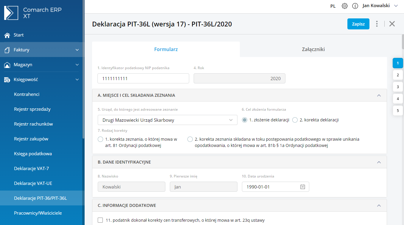 Po przejściu przez kreator otworzy się formularz deklaracji rocznej PIT-36L.