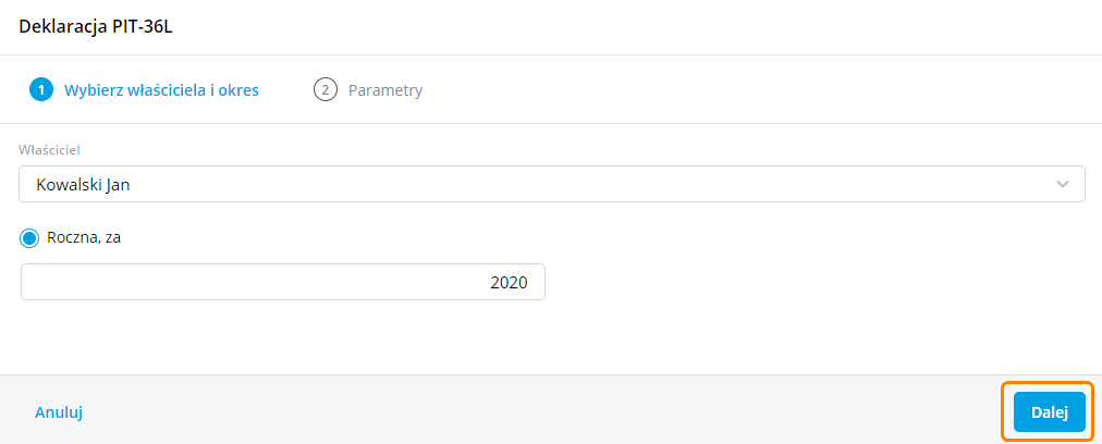 Na kreatorze deklaracji w etapie 1 po wybraniu właściciela należy kliknąć przycisk Dalej.