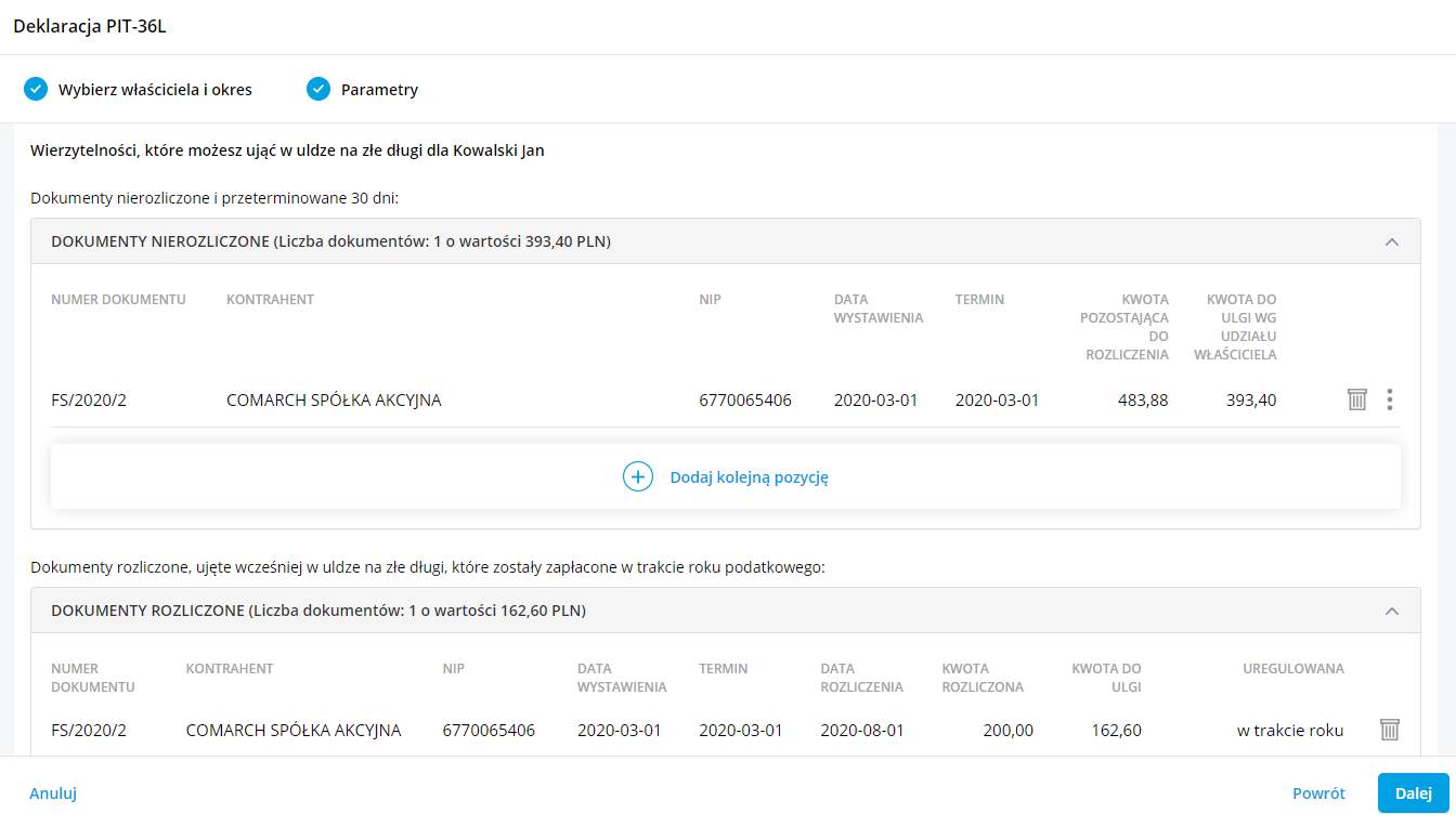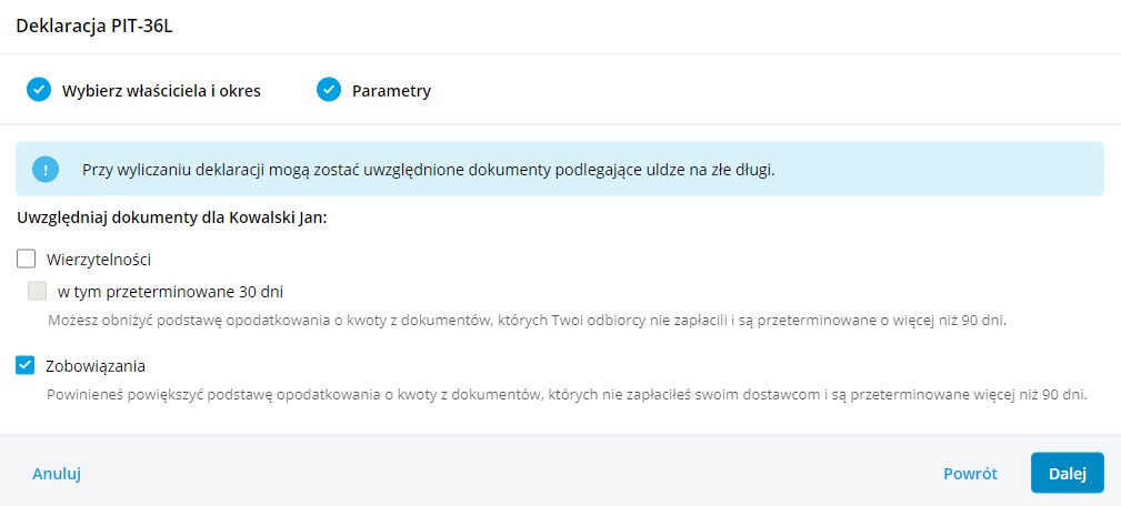 Podczas wyliczania deklaracji PIT-36L na kreatorze została dodana możliwość uwzględnienia dokumentów do ulgi na złe długi. Domyślnie zaznaczona będzie opcja Zobowiązania.