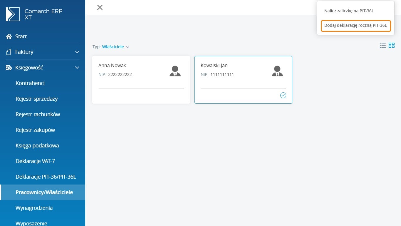 Deklarację roczną PIT-36L/PIT-36LS można również obliczyć po zaznaczeniu właściciela w Księgowość/Pracownicy/Właściciele w menu kontekstowym znajduje się opcja Dodaj deklarację roczną PIT-36L.