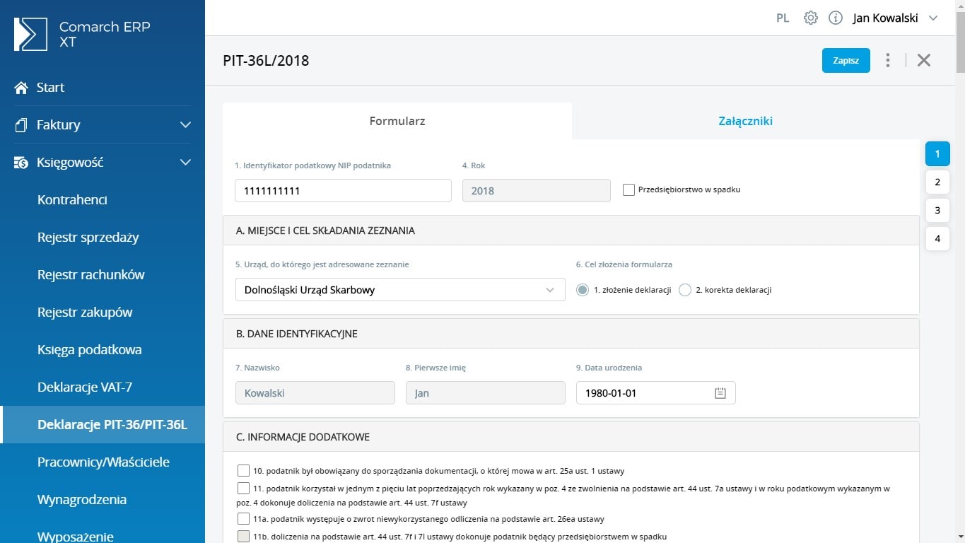Uwaga! Jeżeli na karcie właściciela Użytkownik uzupełni dane takie jak Nazwisko, Imię, numer NIP, data urodzenia to zostaną one przeniesione na formularz deklaracji.
