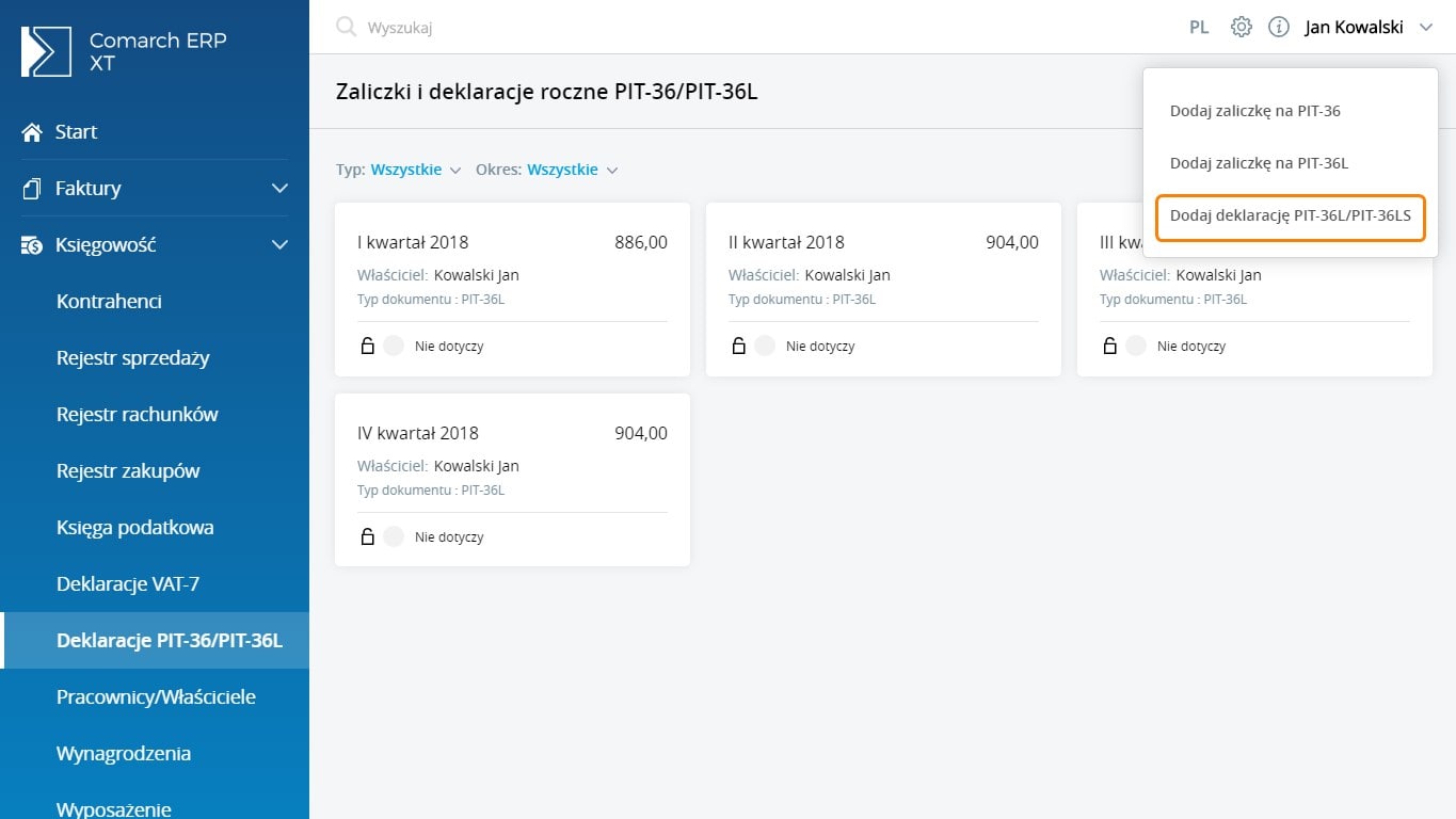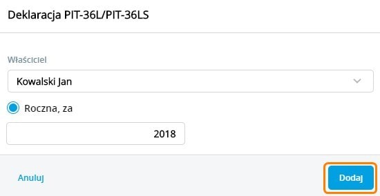 Deklaracja roczna PIT-36L/PIT-36LS jest dostępna z poziomu Księgowość/Deklaracje PIT-36/PIT-36L po wybraniu opcji Dodaj deklarację PIT-36L/PIT-36LS.