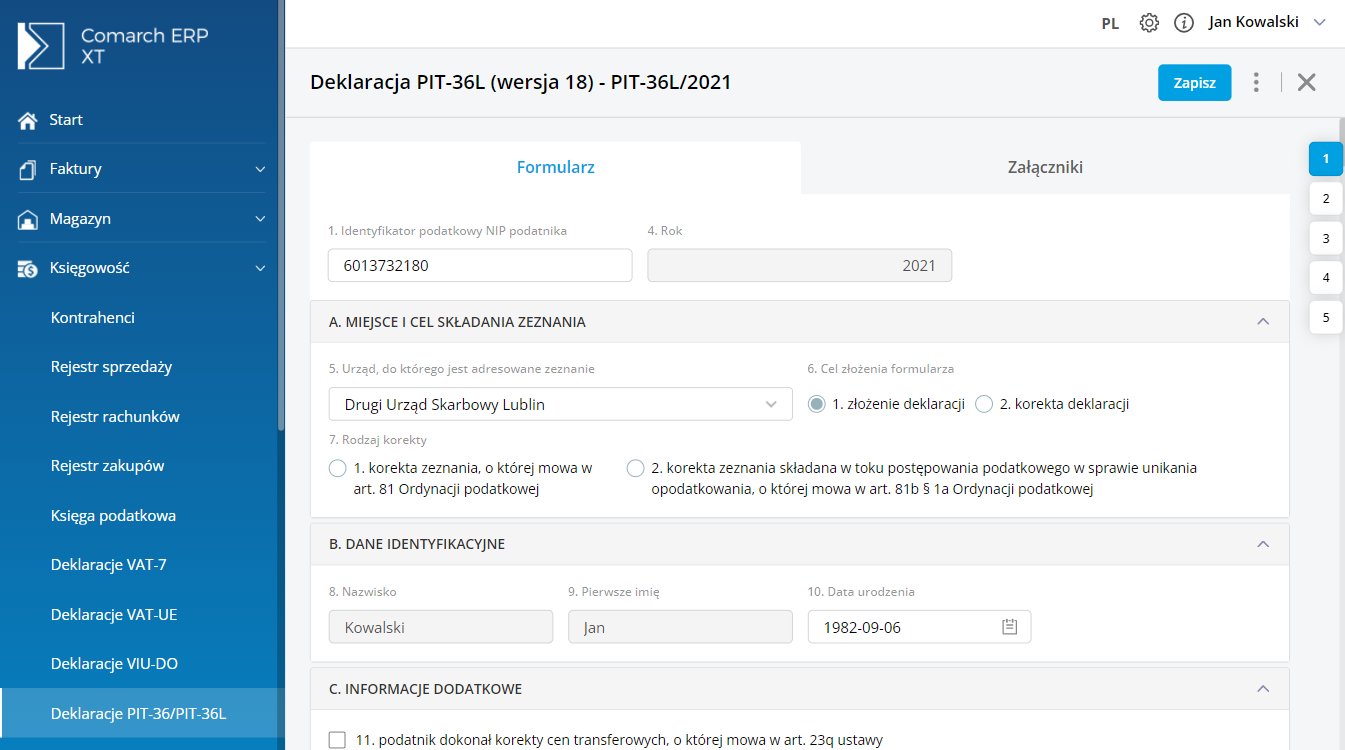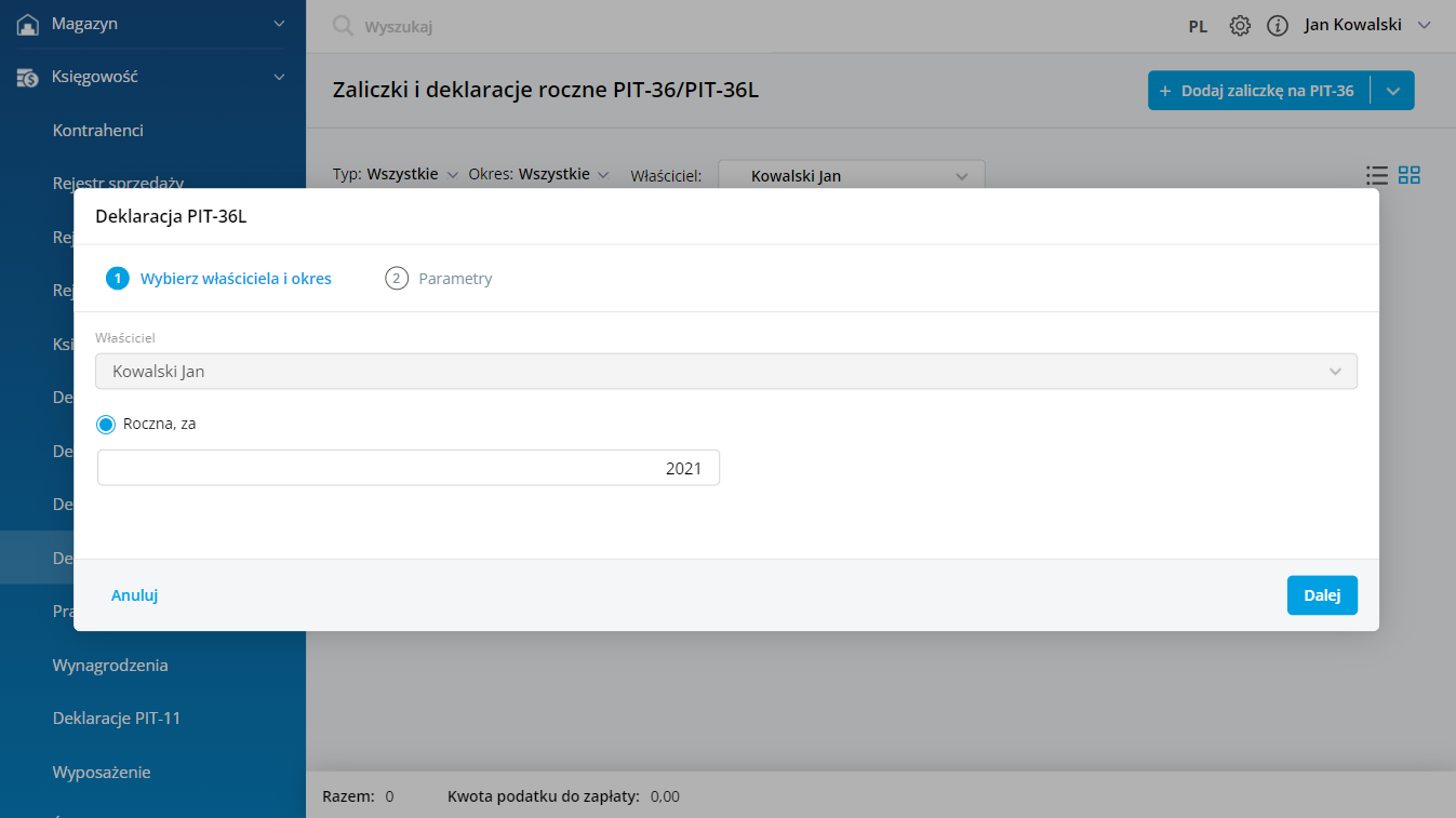 W tym artykule opisaliśmy możliwość wyliczenia deklaracji rocznej PIT-36L. Funkcja jest dostępna dla pakietu z Księgą Podatkową/Księga Handlową.