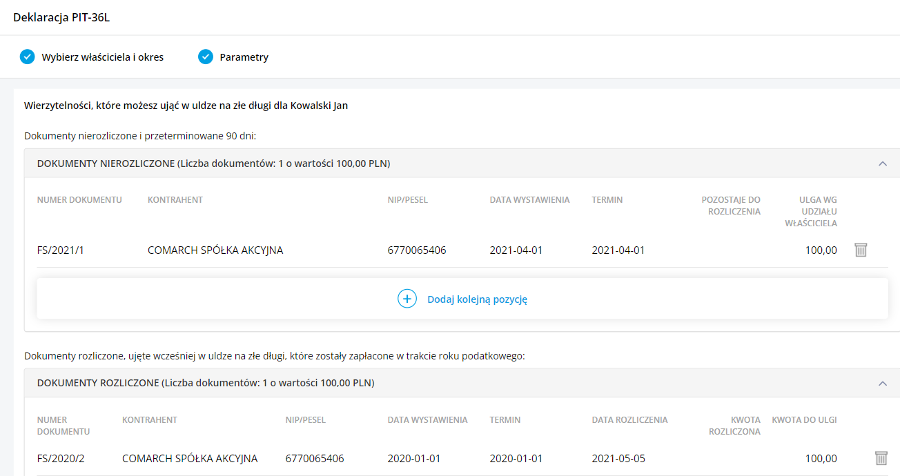 Deklaracja roczna PIT-36L obliczana jest na podstawie zapisów Księgi podatkowej/zapisów księgowych oraz danych wprowadzonych na indywidualnej karcie właściciela, skąd pobierane są kwoty odliczeń od dochodu i podatku oraz informacje o wartości udziałów, kwot przychodów i kosztów uzyskanych z dodatkowej działalności gospodarczej. Deklaracja roczna PIT-36L jest dostępna z poziomu Księgowość/Deklaracje PIT-36/PIT-36L po wybraniu opcji Dodaj deklarację PIT-36L. Na kreatorze deklaracji w etapie 1 po wybraniu właściciela należy kliknąć przycisk Dalej. Podczas wyliczania deklaracji PIT-36L na kreatorze została dodana możliwość uwzględnienia dokumentów do ulgi na złe długi. Domyślnie zaznaczona będzie opcja Zobowiązania. W kolejnym etapie wyświetli się lista dokumentów wierzytelności/zobowiązań zakwalifikowanych do ulgi na złe długi: Na liście dokumentów zakwalifikowanych do ulgi na złe długi są wykazywane pozycje: Lista dokumentów zawiera następujące kolumny: Istnieje możliwość dodania pozycji ręcznie przez Użytkownika. W sekcji Niezapłacone wierzytelności/zobowiązania oraz Zapłacone wierzytelności/zobowiązania jest dostępna opcja ‘Dodaj kolejną pozycję’. Nie ma możliwości dodania pozycji bez uzupełnionego numeru dokumentu. Data wybrana w kolumnie Termin nie może być wcześniejsza niż data wystawienia. W kolumnie Kwota do ulgi należy uzupełnić kwotę podlegającą korekcie. W przypadku zapłaconych zobowiązań i wierzytelności istnieje możliwość wskazania daty zapłaty (nie może być wcześniejsza niż termin płatności). Na dokumentach ręcznie dodawanych do ulgi istnieje możliwość wskazania kontrahenta o rodzaju podmiot gospodarczy lub osoba fizyczna. Wymagane jest uzupełnienie numeru NIP/PESEL kontrahenta. W przypadku gdy na dokumencie handlowym/księgowym zakwalifikowanym do ulgi na złe długi nie został uzupełniony kontrahent to należy usunąć taką pozycję i dodać ponownie ręcznie. Po przejściu przez kreator otworzy się formularz deklaracji rocznej PIT-36L. Deklarację roczną PIT-36L można również obliczyć po zaznaczeniu właściciela w Księgowość/Pracownicy/Właściciele w menu kontekstowym znajduje się opcja Dodaj deklarację roczną PIT-36L. Formularz deklaracji składa się z 2 zakładek: Zakładka 1 – [Sekcja A-S] Sekcja A-C zawiera następujące informacje: Rok, za który deklaracja ma być obliczona. Właściciel – podatnik, dla którego będzie obliczana deklaracja. Podatnika wskazujemy na oknie przy dodawaniu deklaracji poprzez wybór z listy właścicieli. Cel złożenia formularza – złożenie zeznania lub korekta zeznania. W przypadku gdy w poz. 7 Rodzaj korekty wybrano opcję 2. korekta zeznania składana w toku postępowania podatkowego w sprawie unikania opodatkowania, o której mowa w art. 81b § 1a Ordynacji podatkowej, należy wypełnić sekcję ORD-ZU. Uzupełnienie uzasadnienia w sekcji ORD-ZU nie jest wymagane w przypadku wskazania w poz. 7 opcji 1. Korekta zeznania, o której mowa w art. 81 Ordynacji podatkowej. Sekcja Informacje dodatkowe zawiera informacje o zwolnieniach. Nie ma możliwości równoczesnego zaznaczenia: Jeżeli dodano zaliczkę kwartalną na PIT-36L za ostatni kwartał danego roku to na deklaracji PIT-36L(18) automatycznie zaznaczana jest poz. 18 wybrał kwartalny sposób wpłacania zaliczek na podstawie art. 44 ust. 3g ustawy. Jeżeli w danym roku dodano zaliczki uproszczone to po wyliczeniu deklaracji PIT-36L(18) automatycznie zaznaczana jest poz. 19 wybrał wpłacanie zaliczek w formie uproszczonej na podstawie art. 44 ust. 6b ustawy. Sekcja D–E zawiera zestawienie łącznych przychodów i kosztów uzyskania przychodu z pozarolniczej działalności gospodarczych oraz działów specjalnych produkcji rolnej. W tym miejscu program księgowy wylicza odpowiednio wartość dochodu lub straty. W części tej uwidoczniona jest również wartość odliczenia z tytułu ubezpieczenia społecznego. Na formularzu jest możliwość bezpośredniego wprowadzenia odliczeń – kwoty odliczeń są na deklarację również pobierane z indywidualnej karty właściciela. Sekcja F.1–F.5 zawiera sekcje dotyczące zwiększenia podstawy opodatkowania/ zmniejszenia straty oraz zmniejszenia podstawy opodatkowania/ zwiększenia straty. Na zakładkę mogą zostać przeniesione kwoty z załącznika PIT/WZ(2). Kwota straty wykazana z poz. 24 jest przenoszona automatycznie do poz. 44. Kwota straty wykazana z poz. 29 jest przenoszona automatycznie do poz. 45. Jeżeli do deklaracji PIT-36L(18) dodano załącznik PIT/WZ(2) to uzupełniane są odpowiednia pola w sekcjach: Sekcja F.2.: Sekcja F.3.: Sekcja F.5.: Kwota niezapłaconych wierzytelności oraz zapłaconych zobowiązań przenoszona jest na formularz PIT-36L(18) do poz. 58. W przypadku niezapłaconych wierzytelności uwzględniana jest pełna kwota dokumentu, która w całości mieści się w poz. 56 Dochód do opodatkowania. Jeśli dany dokument nie może zostać skorygowany ze względu na niewystarczającą kwotę dochodu do opodatkowania, to pod uwagę brane są kolejne dokumenty. Te, które zmieściłyby się częściowo nie są oznaczane jako zakwalifikowane do ulgi i w przypadku chęci wykazania ich na zaliczkach trzeba będzie ręcznie zmodyfikować kwotę do ulgi. Wartość dokumentu, który nie mieści się w kwocie dochodu do opodatkowania przenoszona jest do poz. 60 Wartość nierozliczonych wierzytelności i zobowiązań zmniejszających podstawę obliczenia podatku, do odliczenia w kolejnych latach na podstawie art. 26i ust. 3 oraz ust. 8 ustawy. Sekcja G–I pozwala na wyliczenie podatku wg stawki liniowej 19% oraz obliczenie zobowiązania podatkowego. Sekcja J zawiera należne zaliczki, należny podatek, zapłacony podatek oraz zapłacone zaliczki dla poszczególnych miesięcy/kwartałów. Kwoty wyliczone w pozycjach dotyczących należnych zaliczek (w tym kwoty wykazane na podstawie zaliczek 