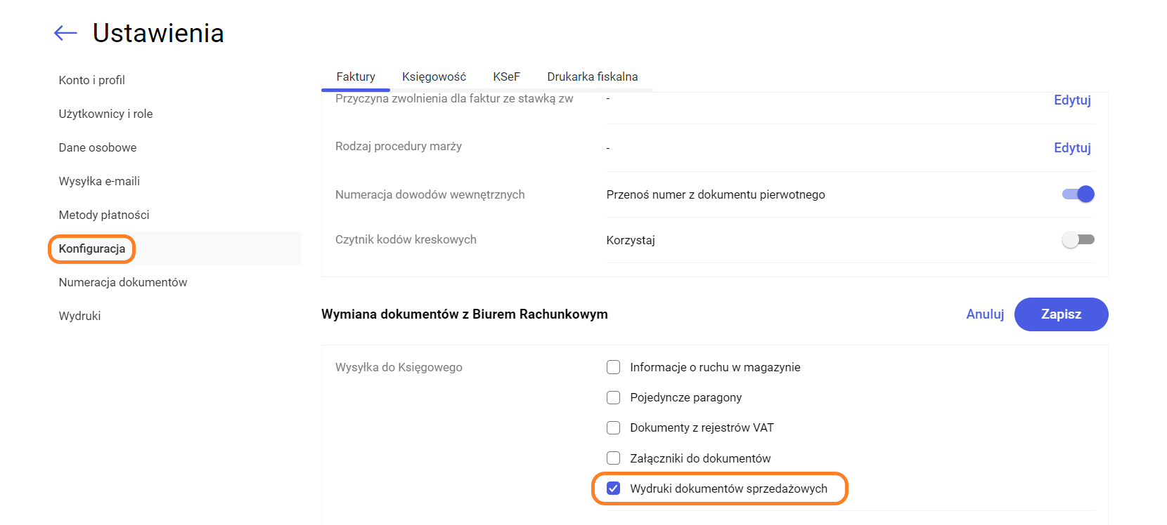 Krok 1. W Konfiguracji / Konfiguracji / Faktury należy zaznaczyć parametr „Wydruki dokumentów sprzedażowych”