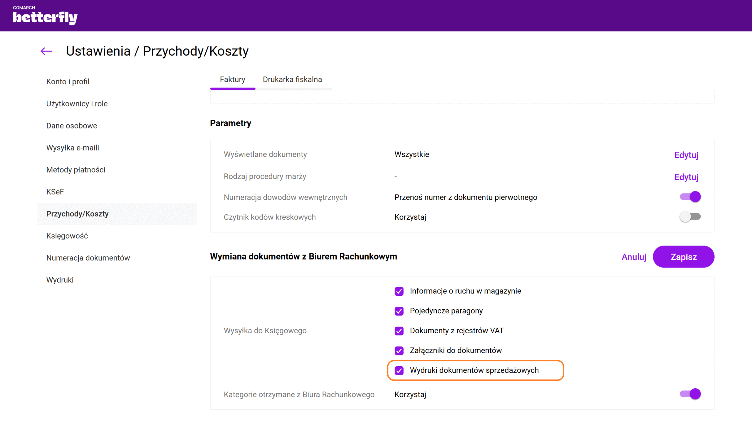 Krok 1. W Ustawienia / Przychody/Koszty / Faktury należy zaznaczyć parametr „Wydruki dokumentów sprzedażowych”