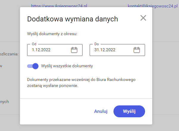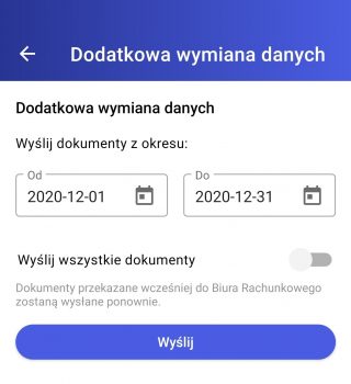 W menu Moje Biuro Rachunkowe – Dodatkowa wymiana danych, można wysyłać dokumenty z dowolnego okresu. Należy uzupełnić zakres dat i wysłać dokumenty za pomocą opcji Wyślij.