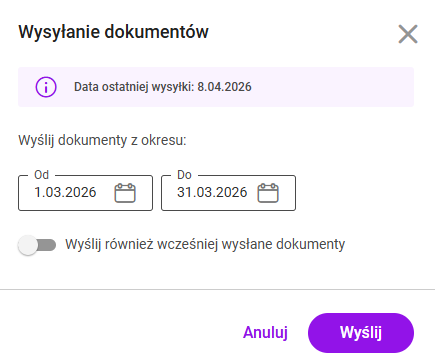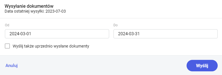 Krok drugi – zostaniemy poproszeni o wskazanie zakresu dat, z którego mają zostać wysłane dokumenty. Możemy także wskazać czy chcemy wysłać dokumenty, które już zostały wcześniej wysłane. Po wybraniu opcji „Wyślij” paczka zostanie wysłania do naszego Księgowego.
