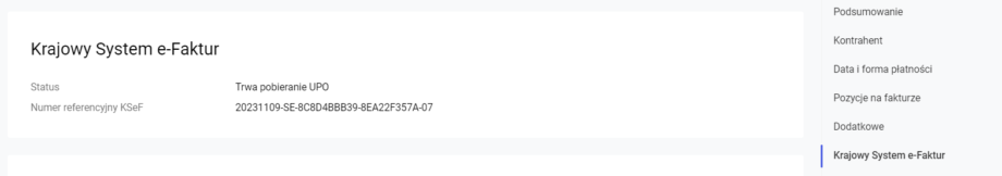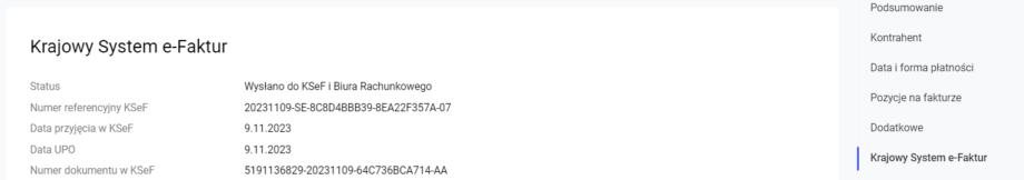 Status dokumentu w KSeF oraz jego numer można sprawdzić na formularzu dokumentu w sekcji Krajowy System e-Faktur.