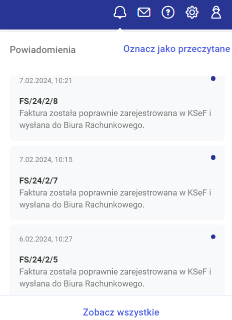 Po zalogowaniu na konto w aplikacji dostępne jest Centrum powiadomień. W Centrum zbierane są powiadomienia dotyczące m.in. wysyłania dokumentów do KSeF i Biura Rachunkowego.