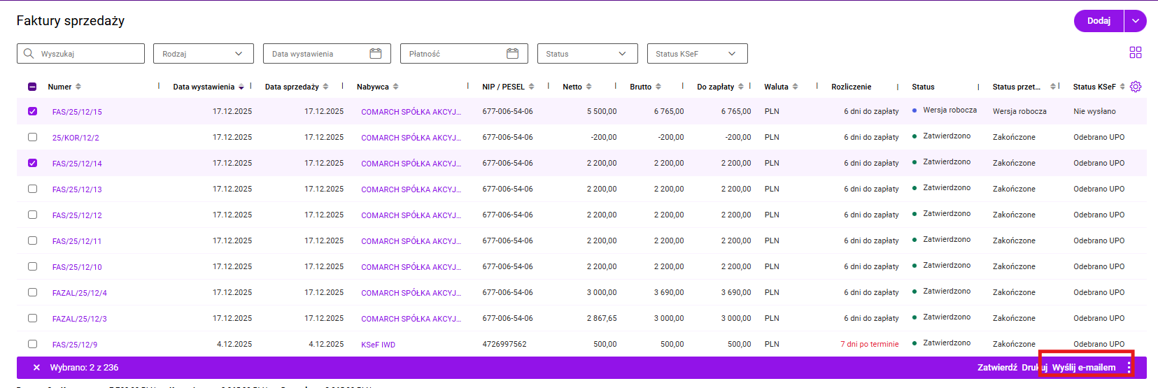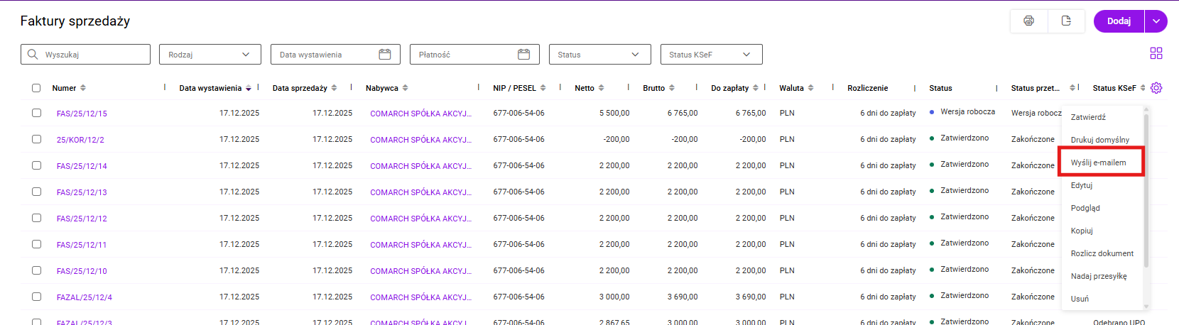 Wysyłanie faktur w formie załącznika za pomocą e-maila z firmowego adresu stało się bardzo powszechne. W programie Comarch Betterfly można wysłać dokument z: