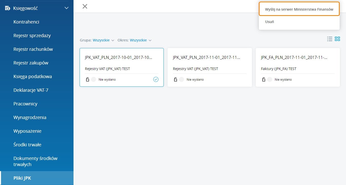Pliki JPK można wysłać bezpośrednio po utworzeniu klikając przycisk Wyślij plik do MF lub też z listy, w tym celu należy zaznaczyć plik, a następnie w menu kontekstowym wybrać Wyślij na serwer Ministerstwa Finansów.